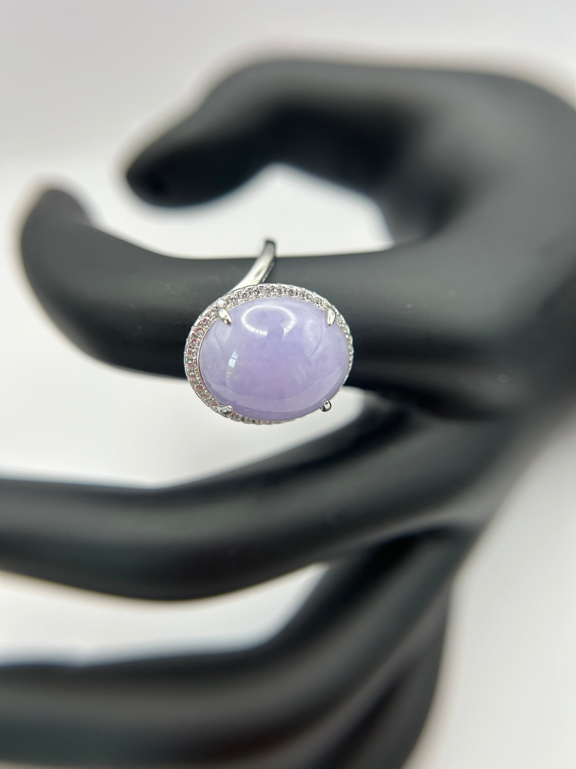Natural grade A Burmese Lavender Jadeite cabochon with Cubic Zirconia Silver Ring