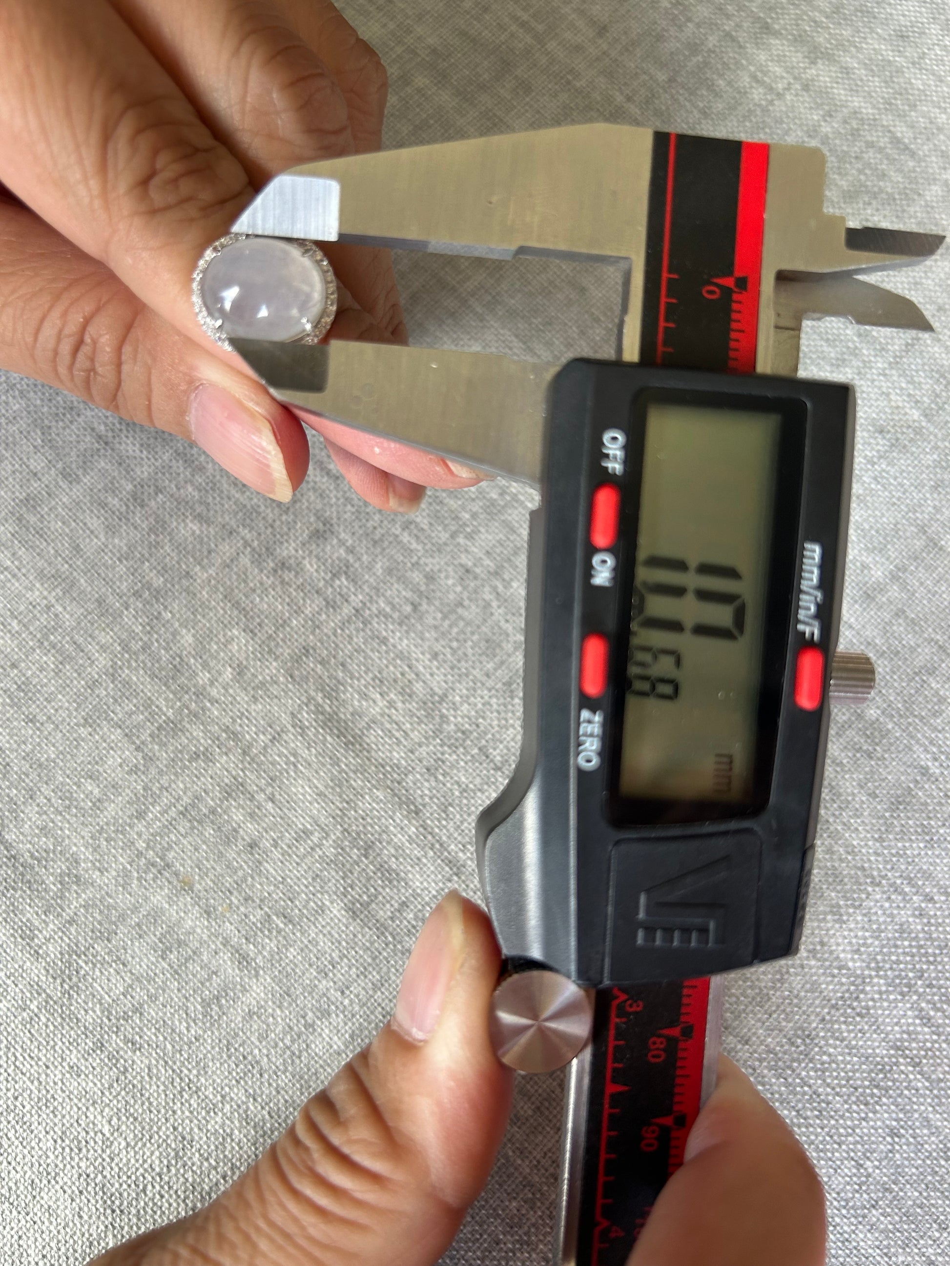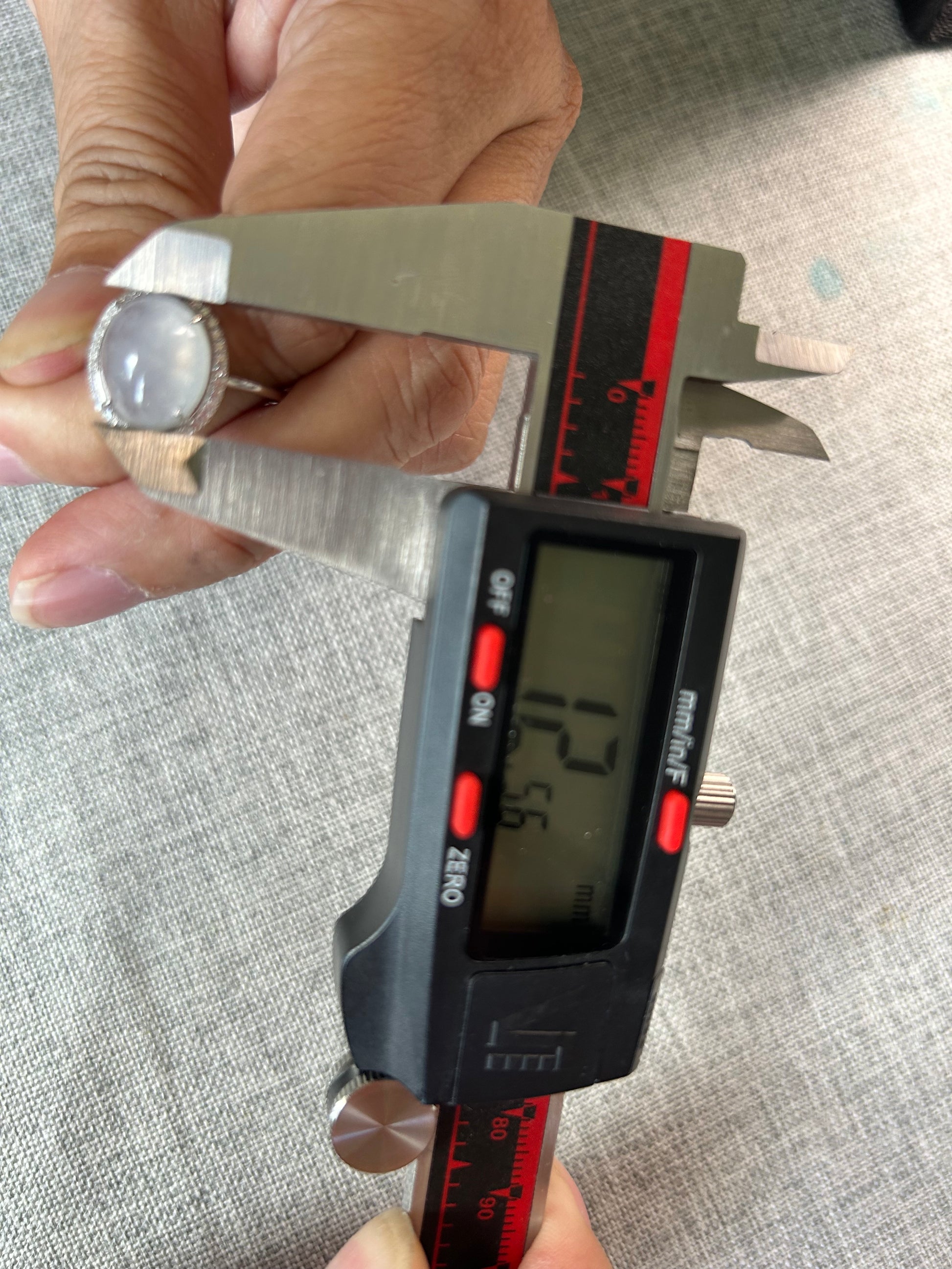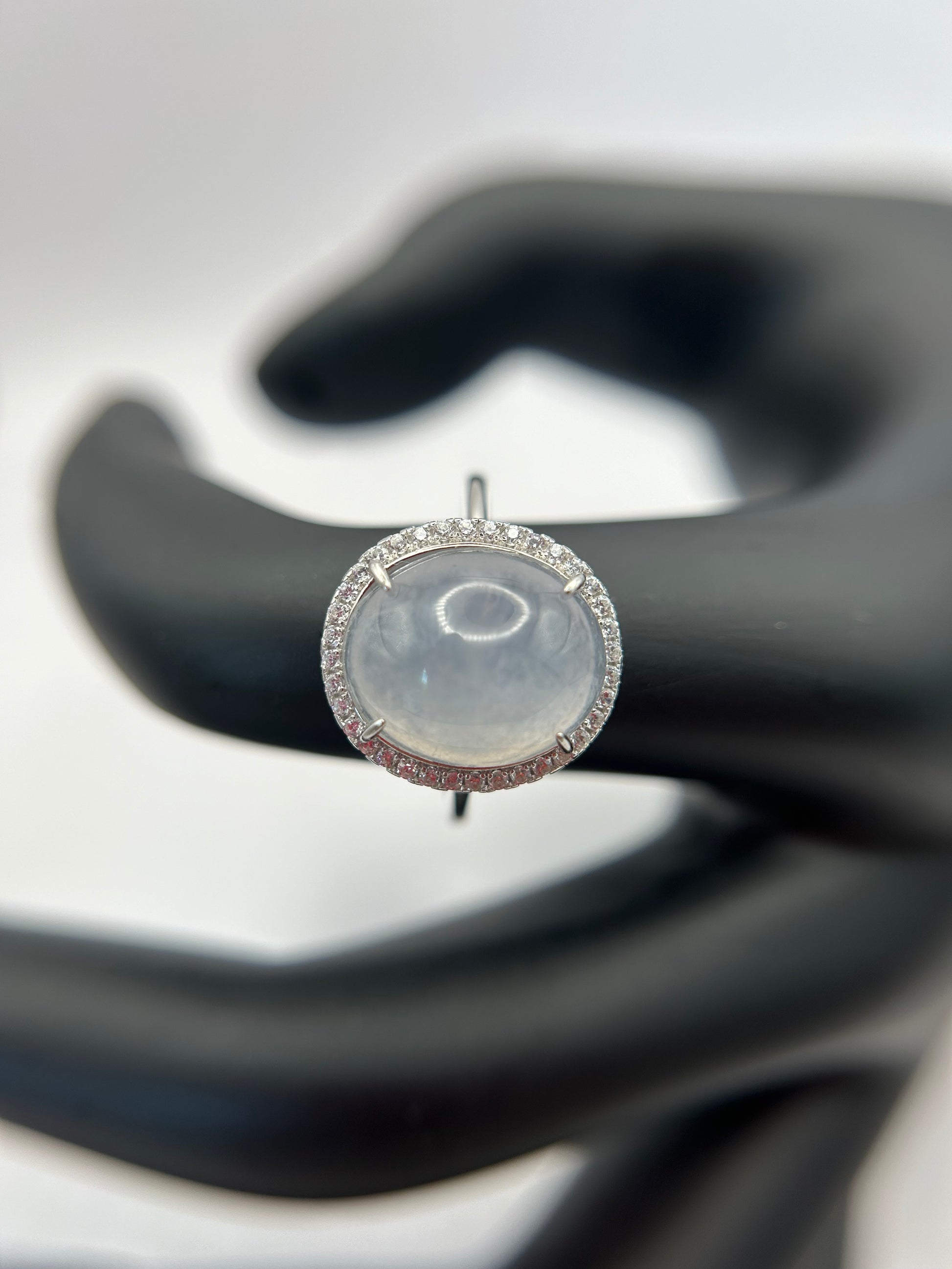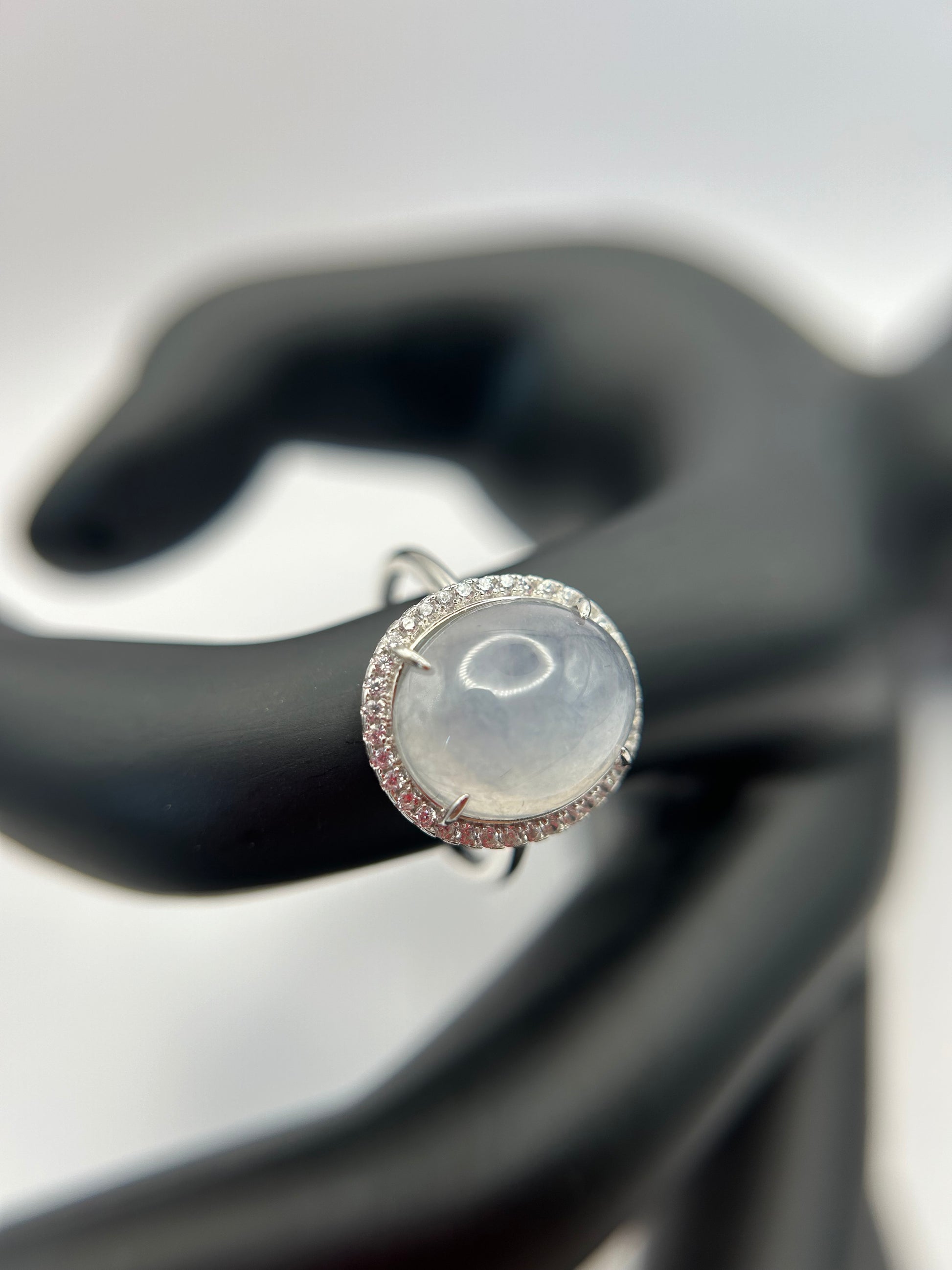This is a Grade A Burma white cabochon jadeite with Cubic Zirconia sterling silver adjustable ring. The jadeite cabochon size is 12.56X 10.68mm