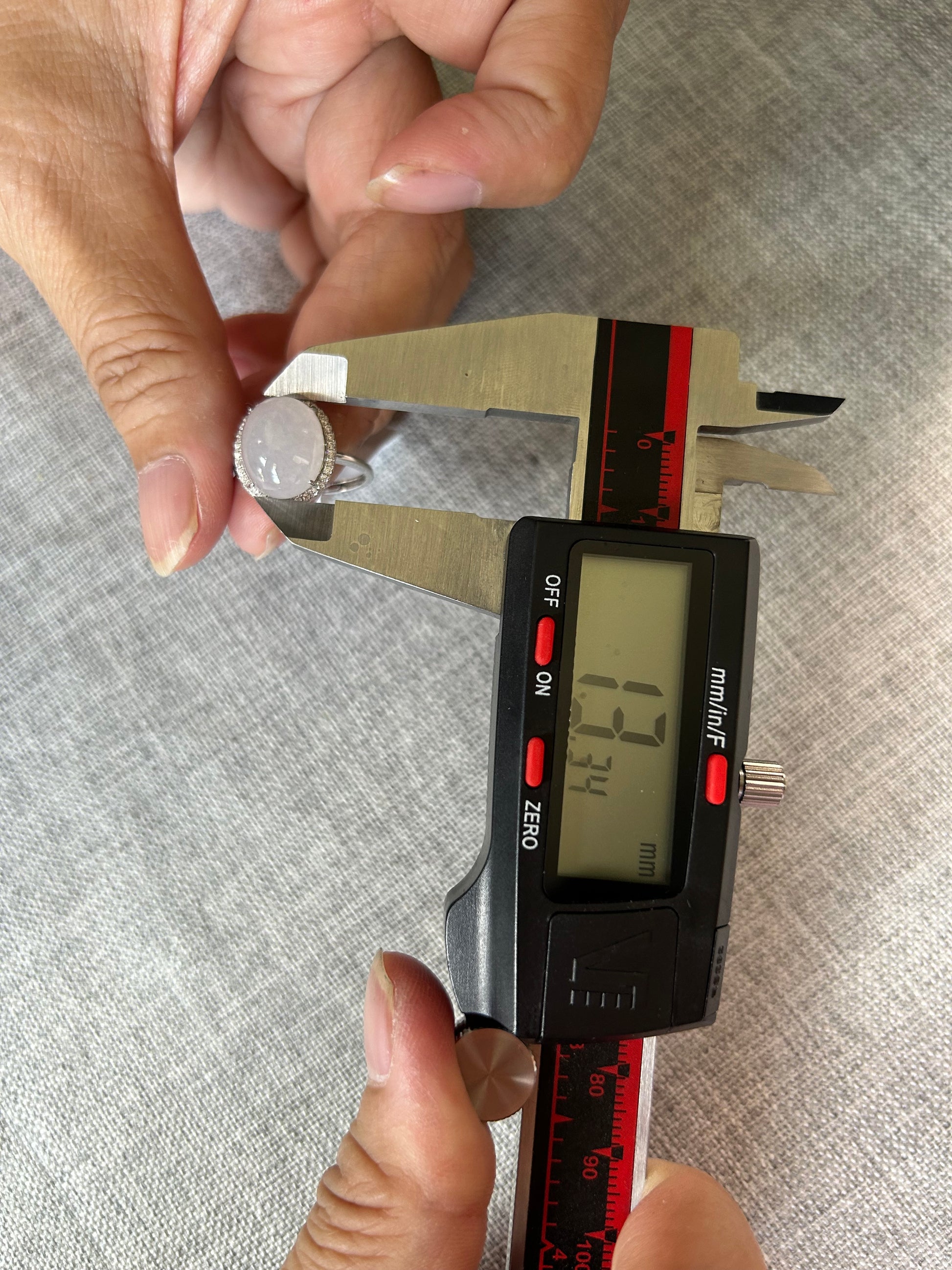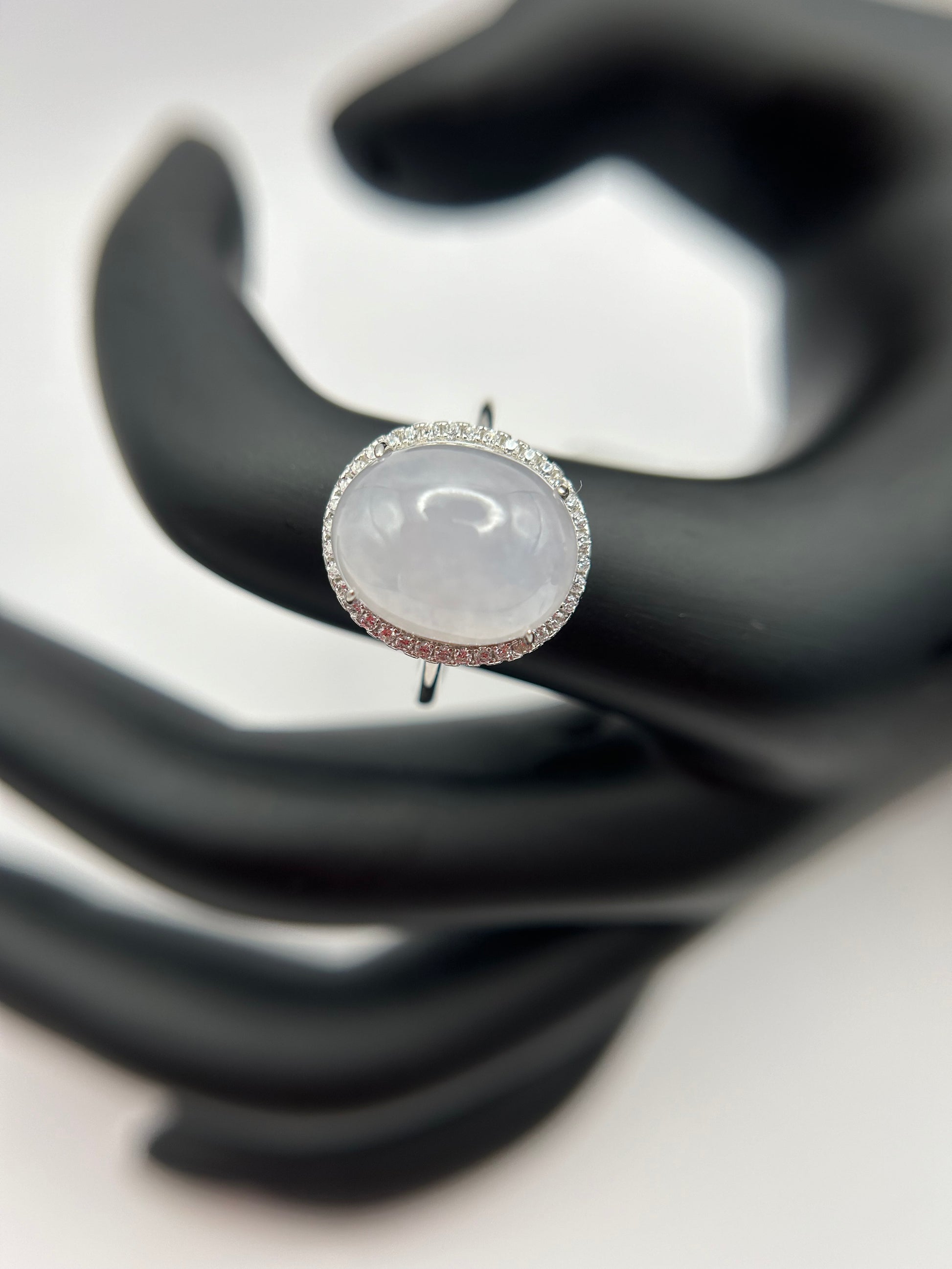 This is a Grade A Burma white cabochon jadeite with Cubic Zirconia sterling silver adjustable ring. The jadeite cabochon size is 13.34X 10.95mm