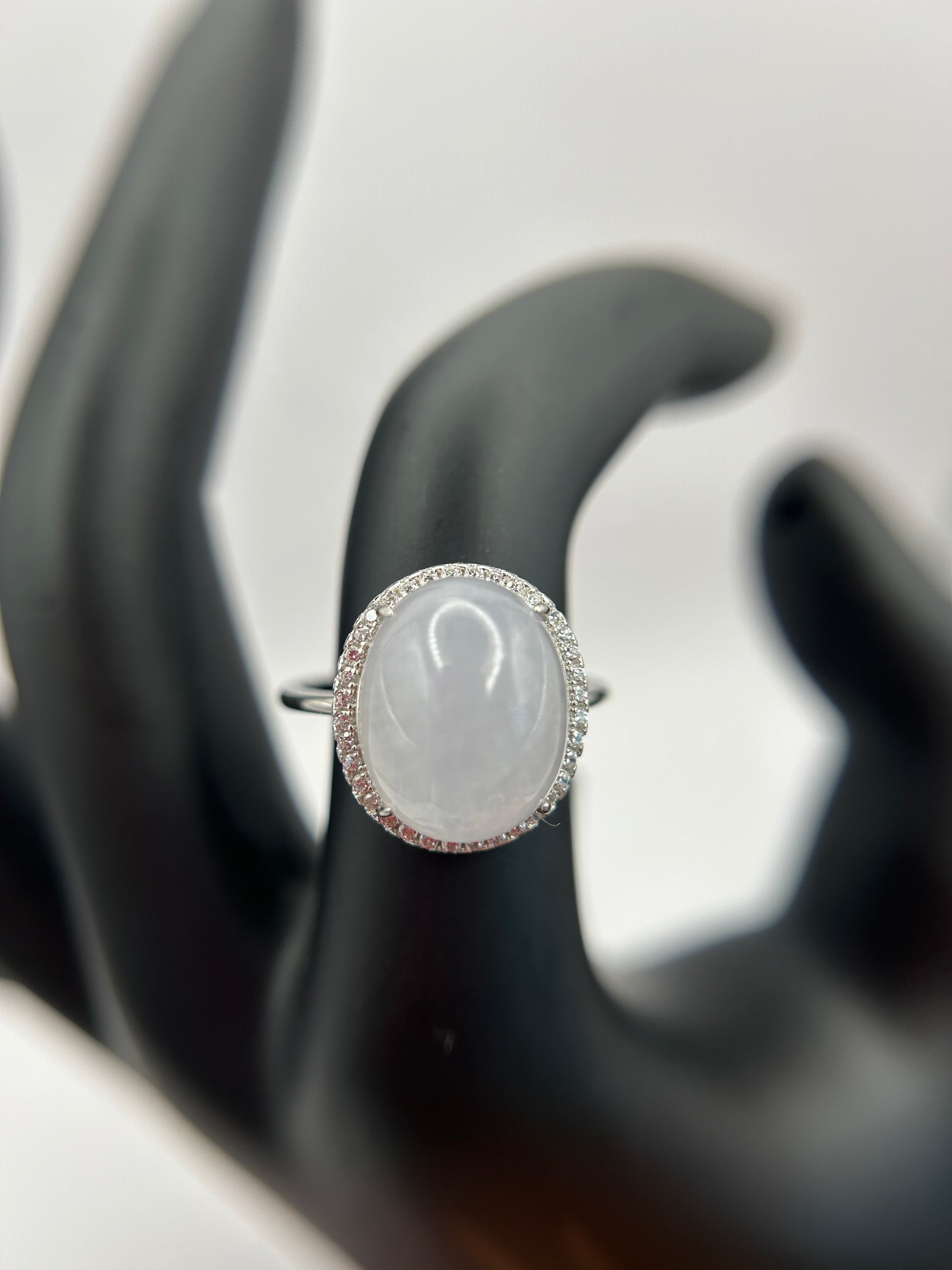 Natural grade A Burma White Jadeite cabochon with Cubic Zirconia Silver Ring