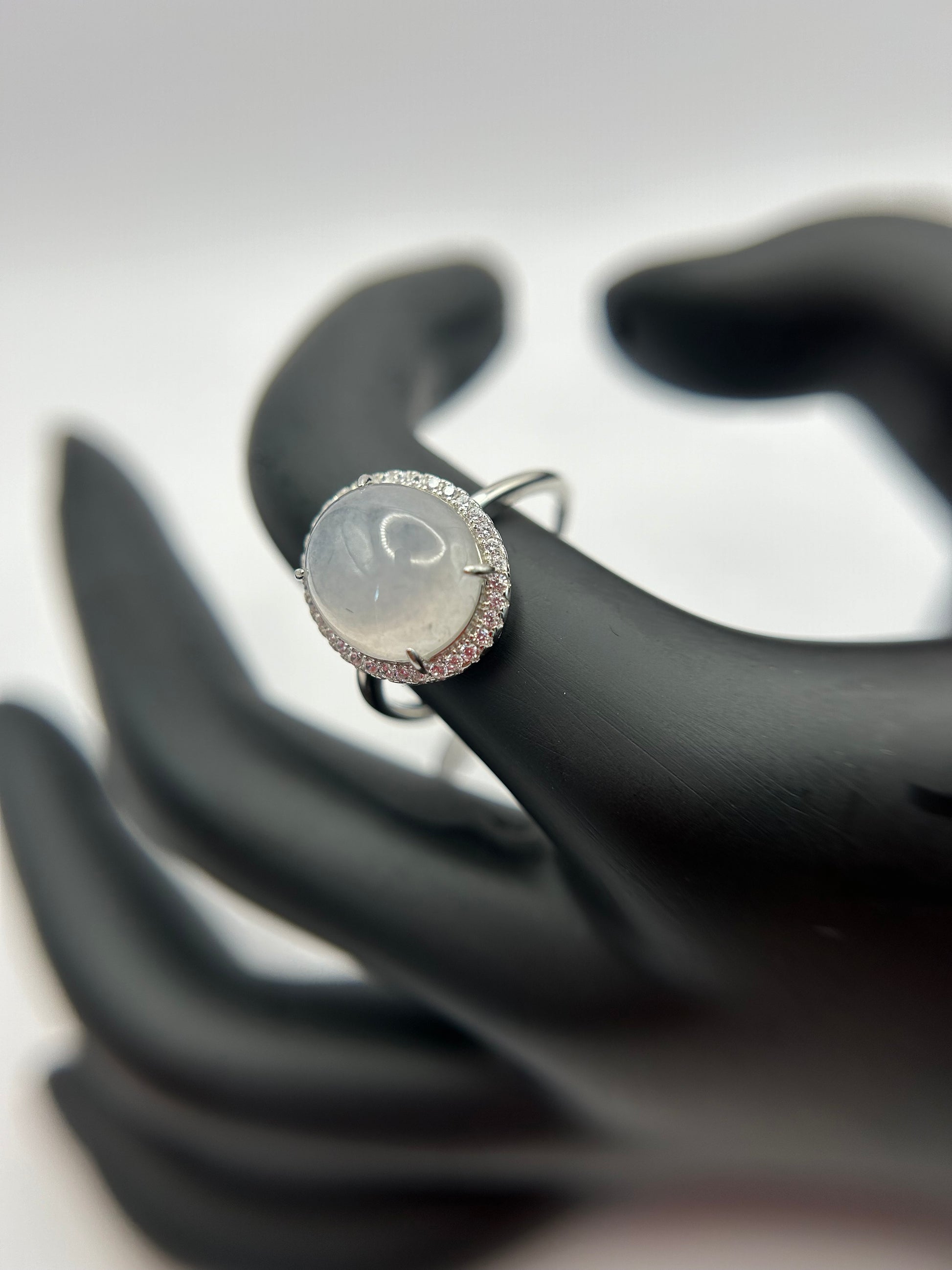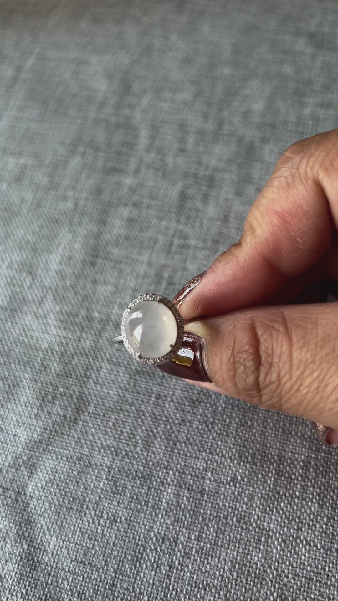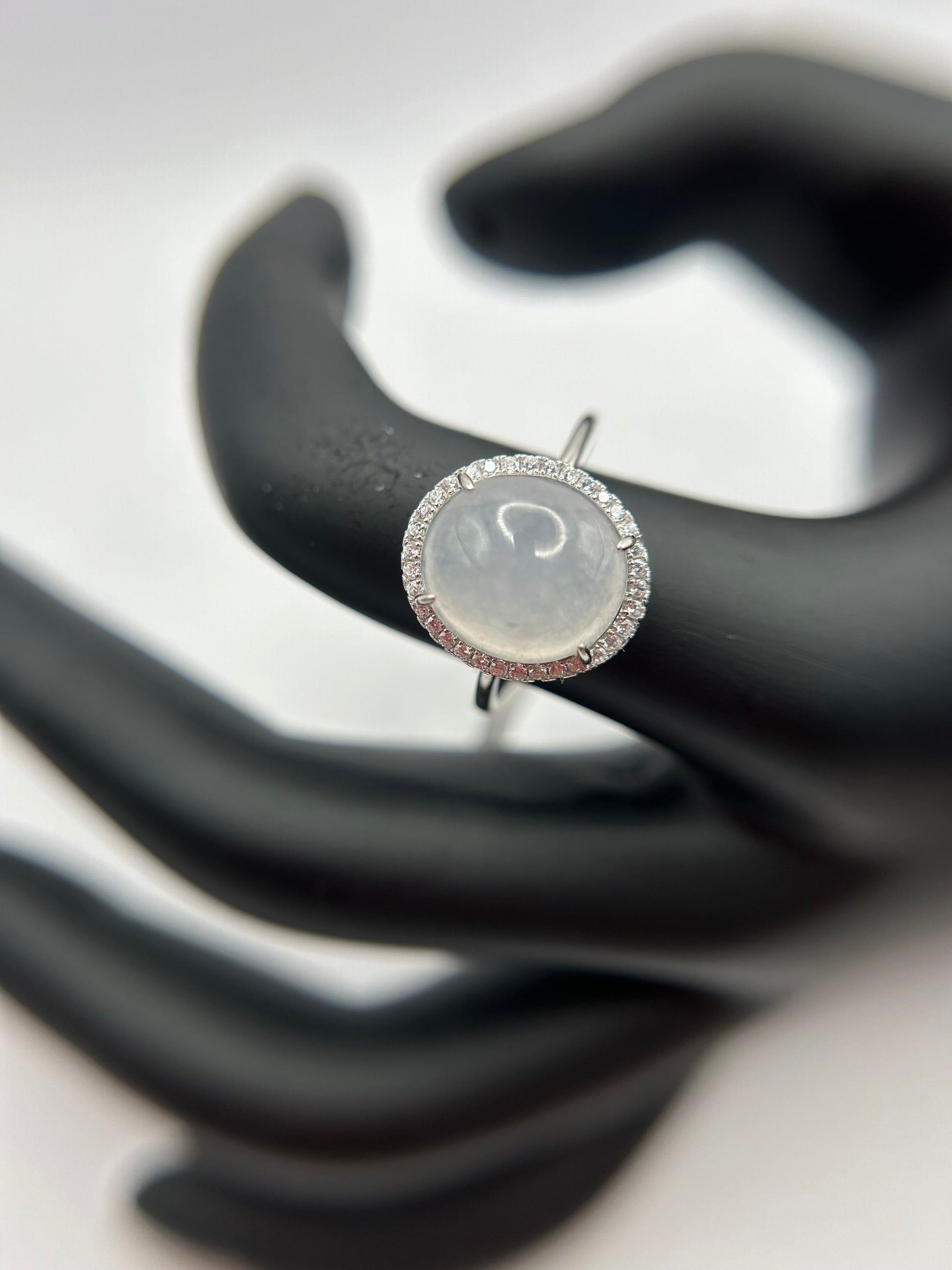 This is a Grade A Burma white cabochon jadeite with Cubic Zirconia sterling silver adjustable ring. The jadeite cabochon size is 11.63X 10.38mm