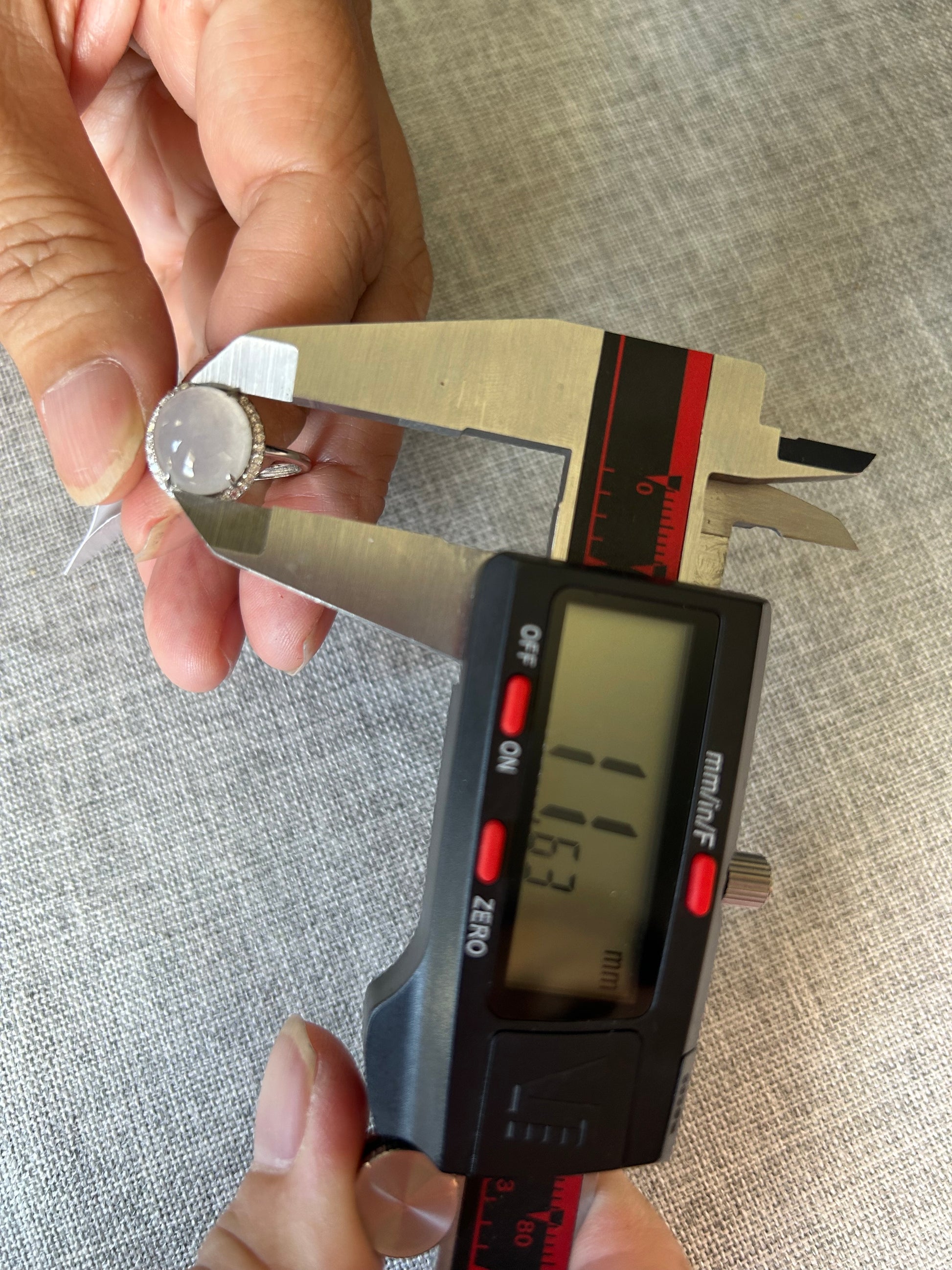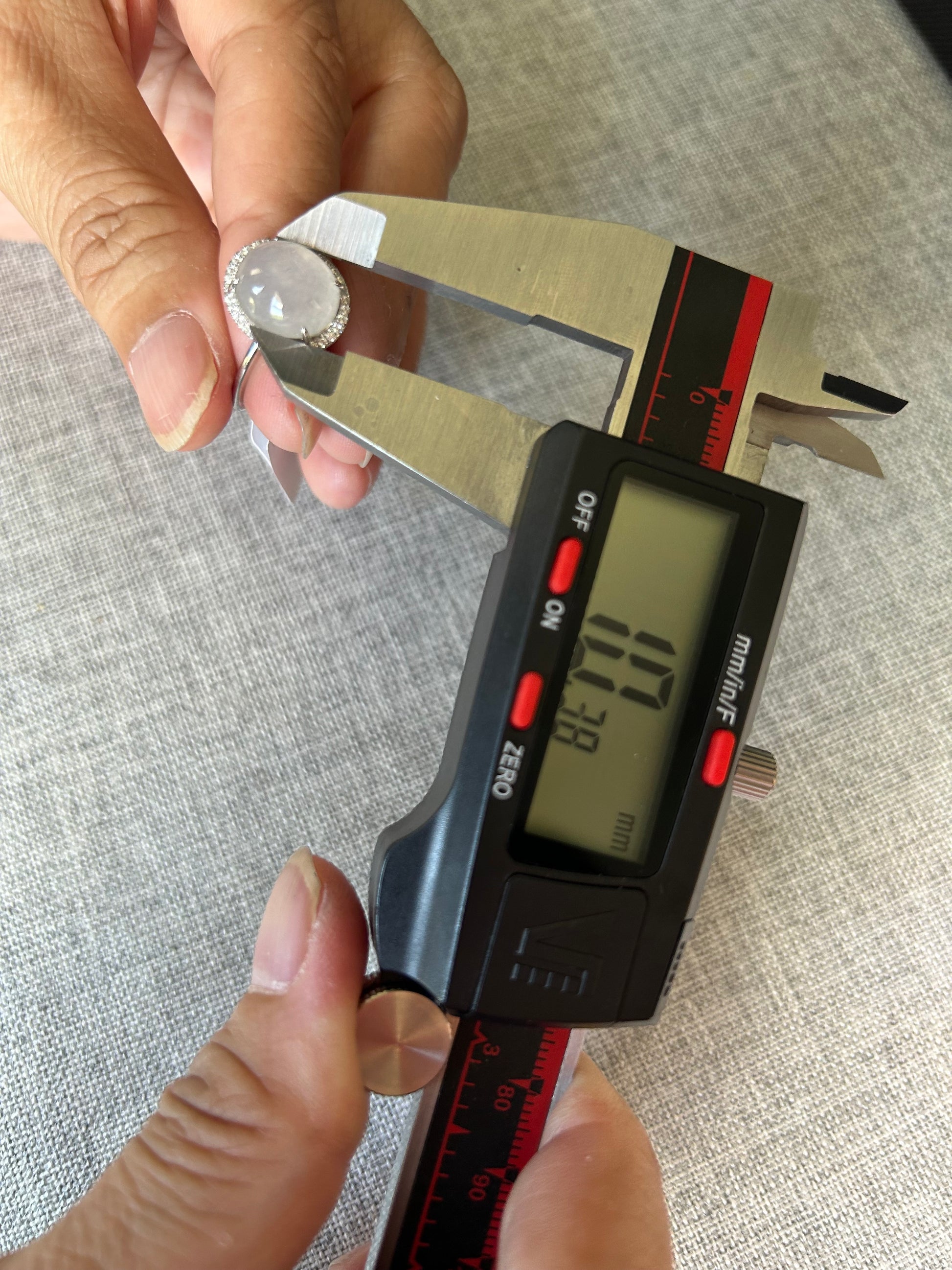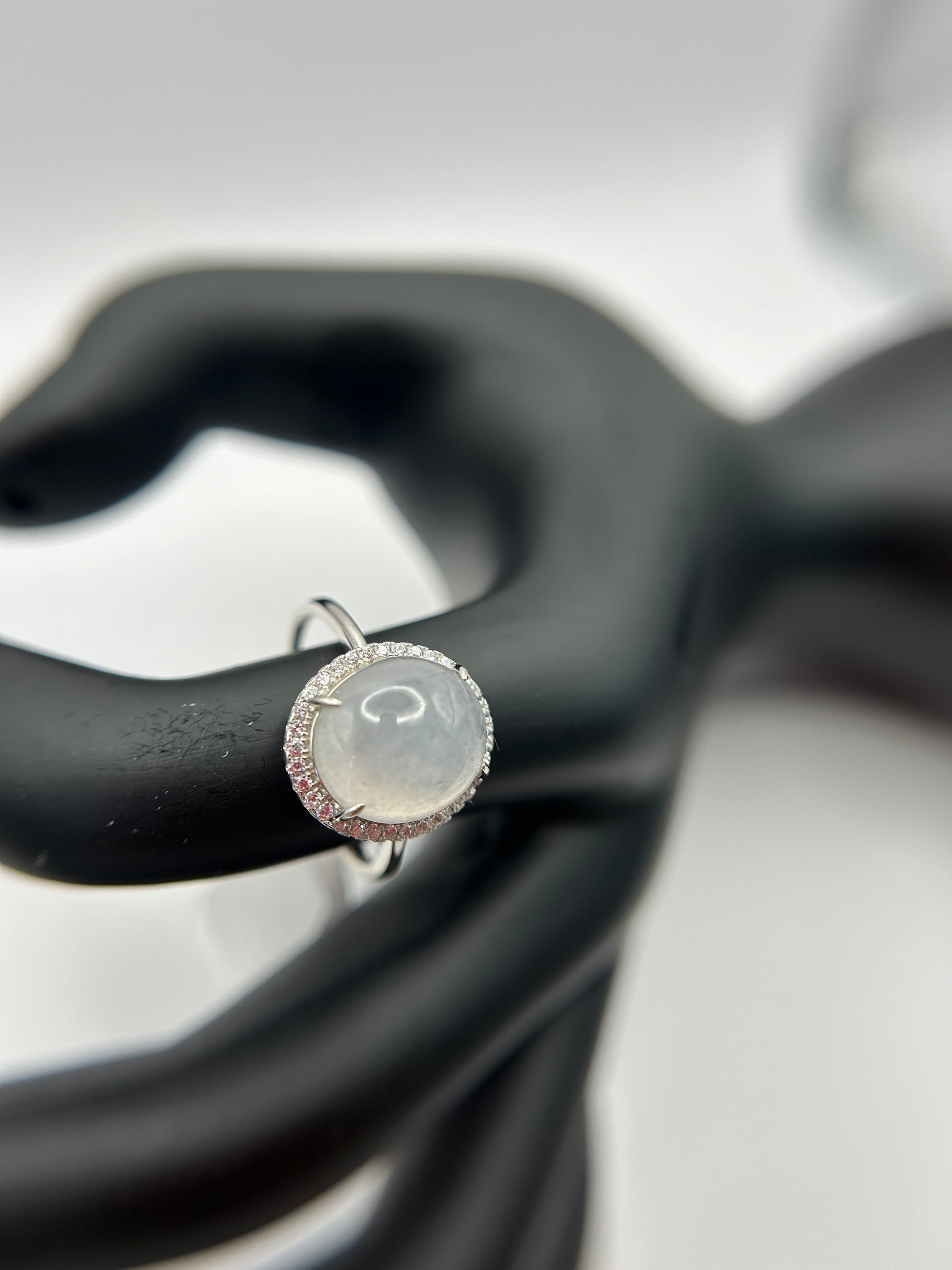 This is a Grade A Burma white cabochon jadeite with Cubic Zirconia sterling silver adjustable ring. The jadeite cabochon size is 11.63X 10.38mm