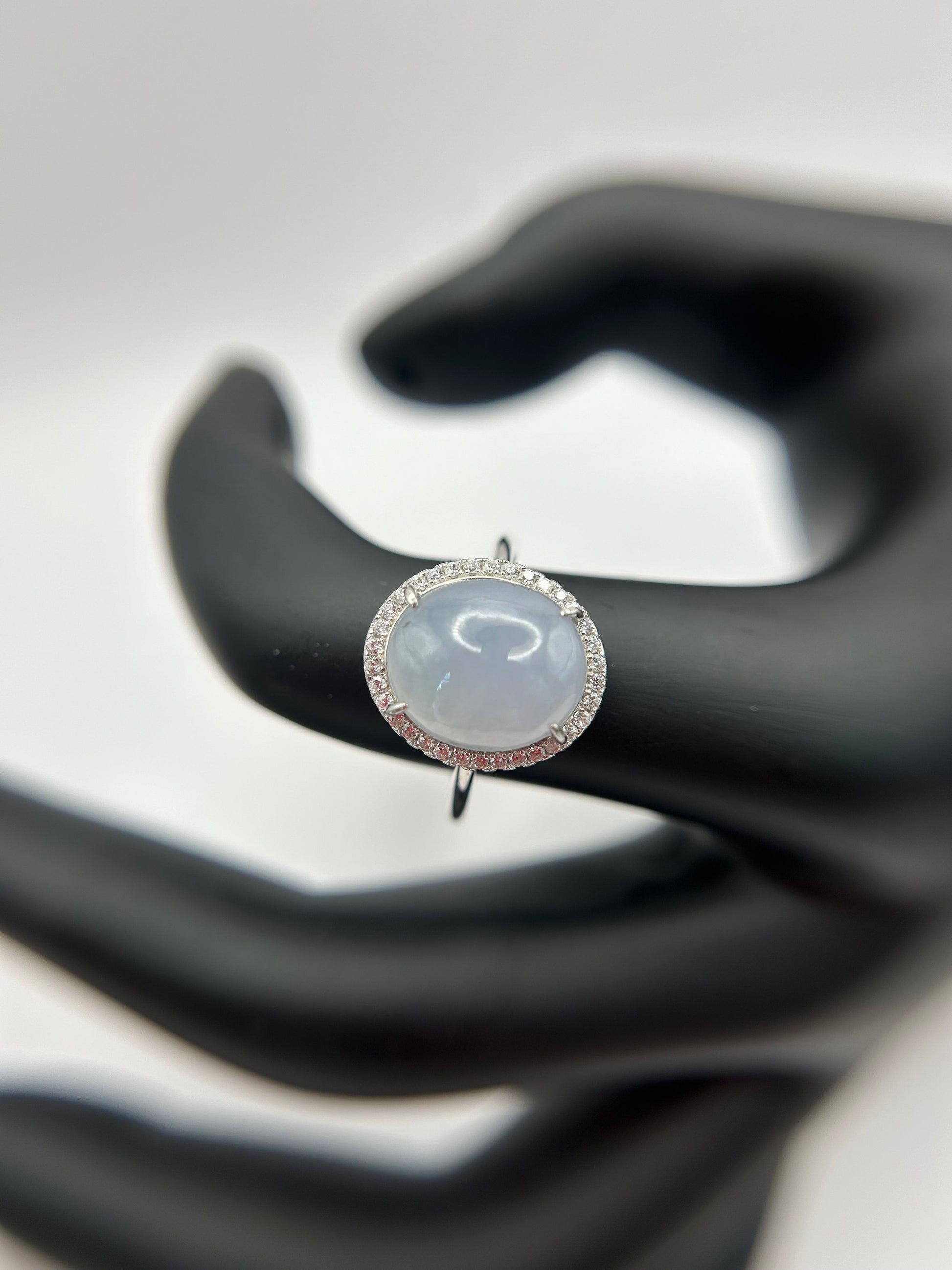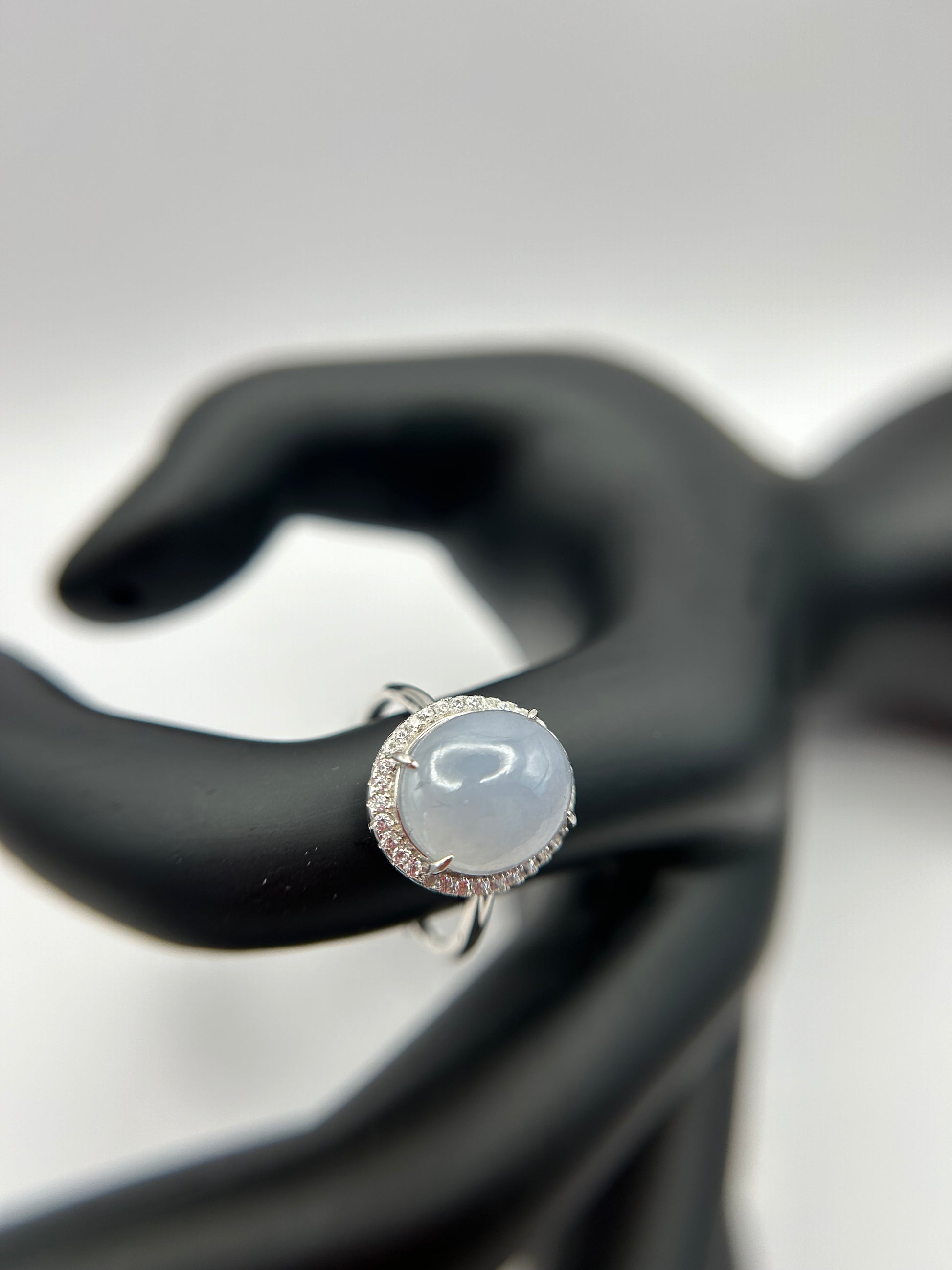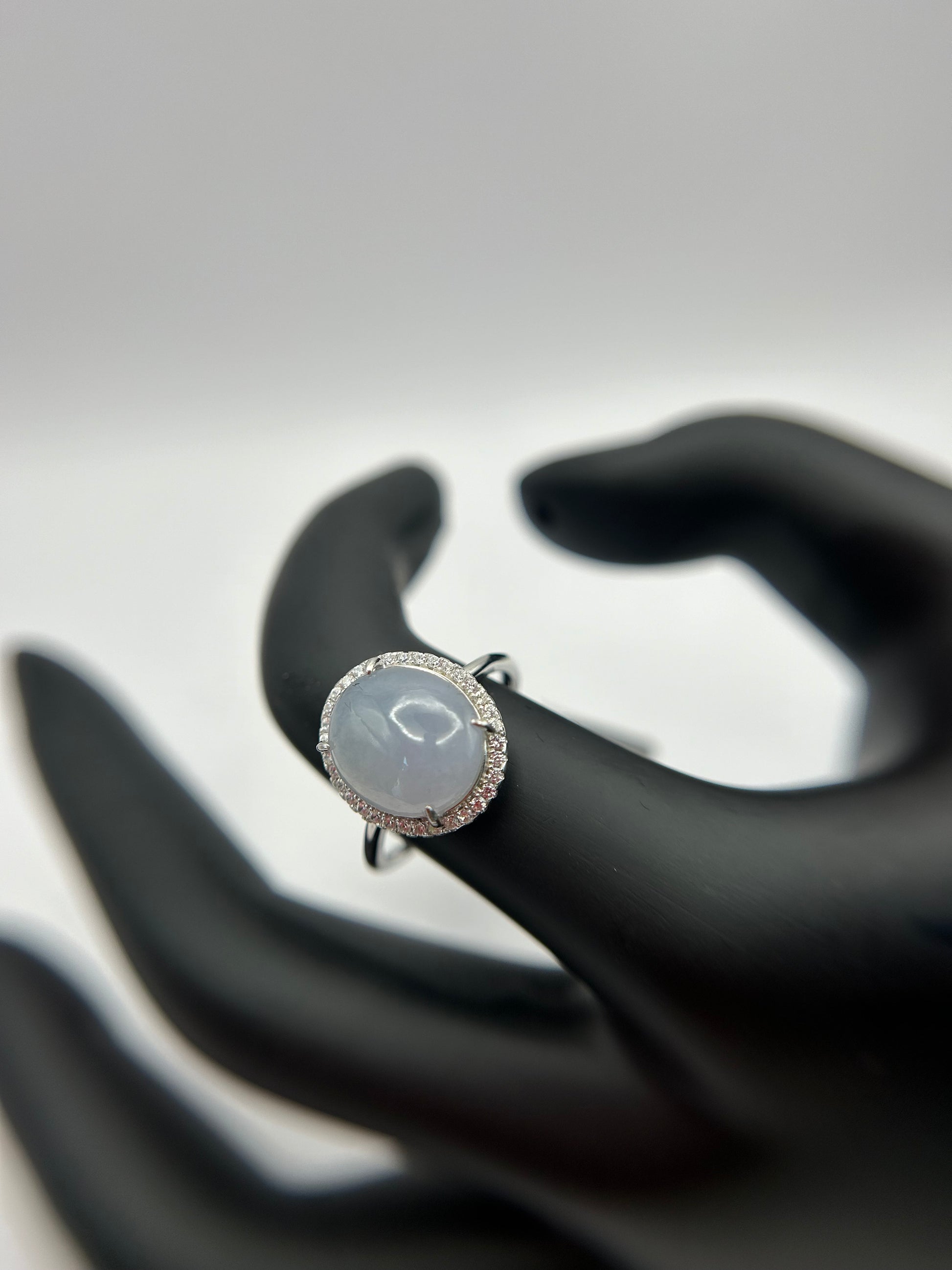 This is a Grade A Burma white cabochon jadeite with Cubic Zirconia sterling silver adjustable ring. The jadeite cabochon size is 11.63X 9.77mm