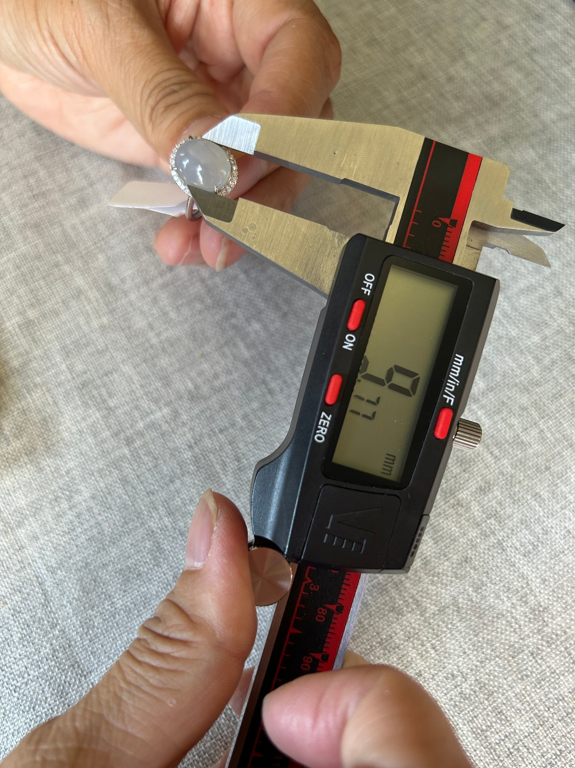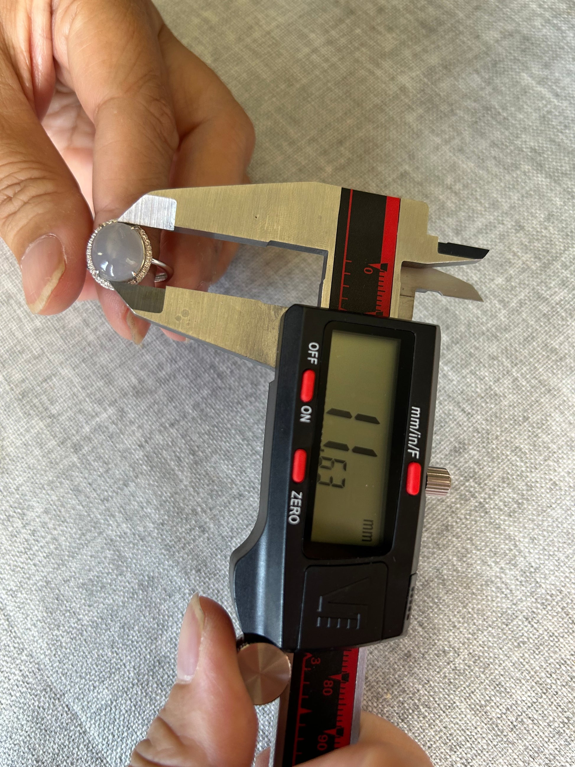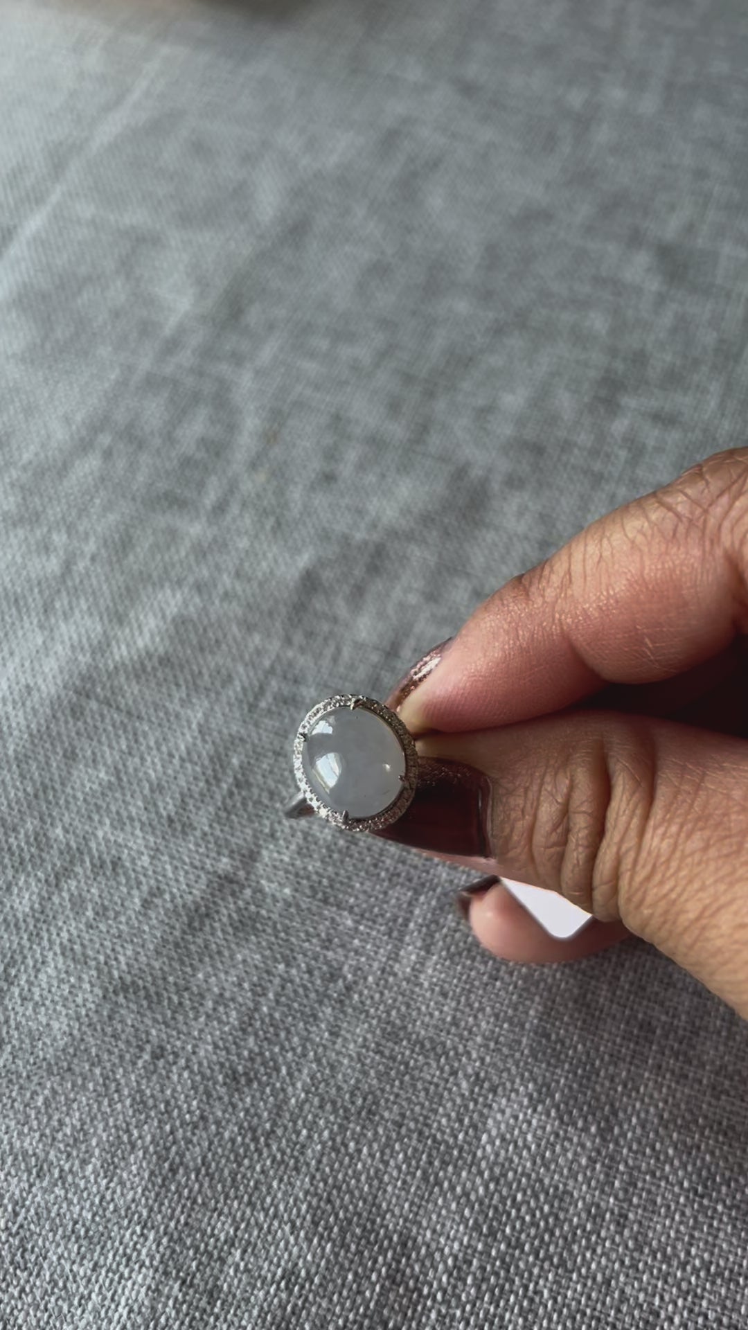 This is a Grade A Burma white cabochon jadeite with Cubic Zirconia sterling silver adjustable ring. The jadeite cabochon size is 11.63X 9.77mm