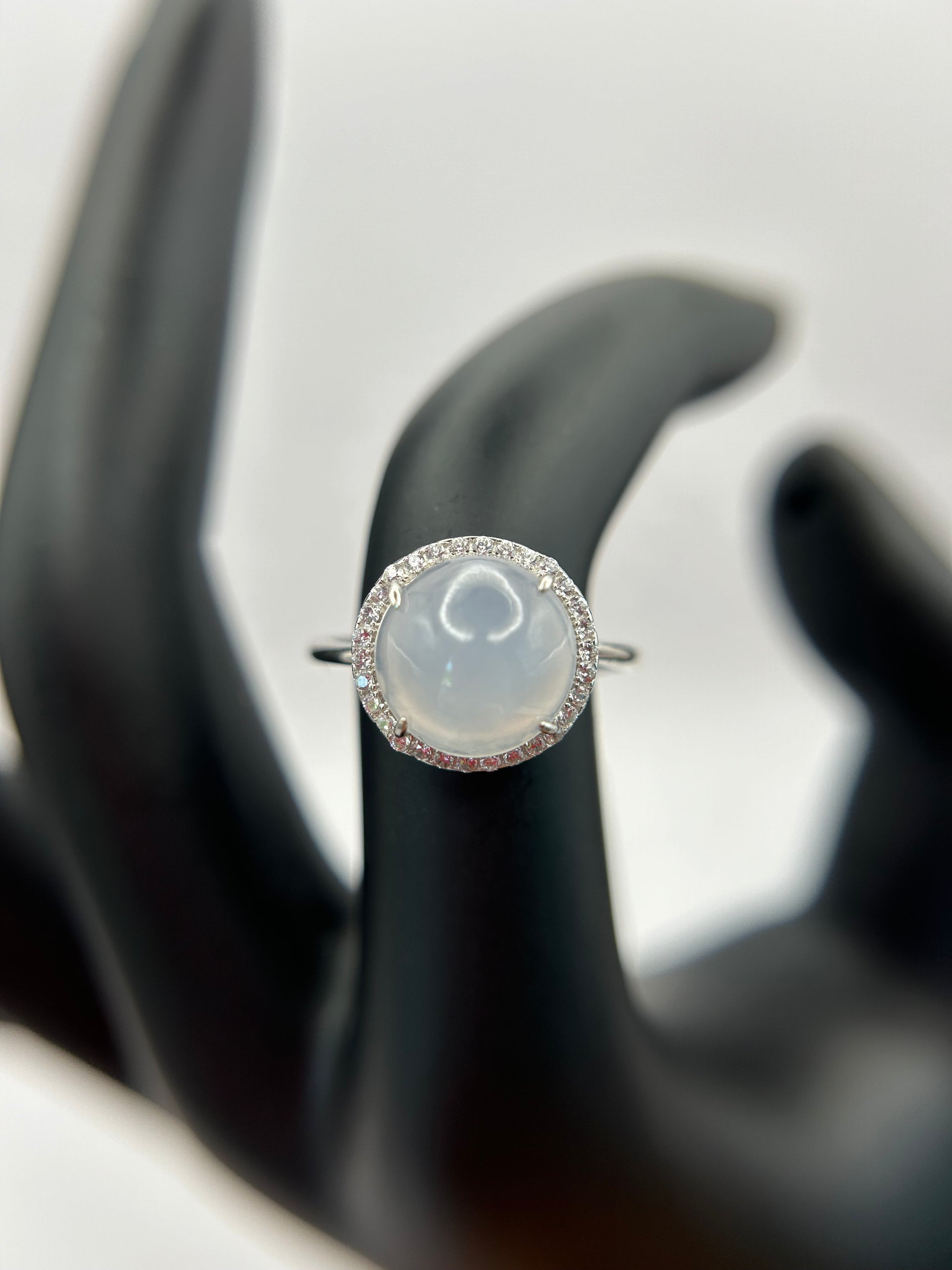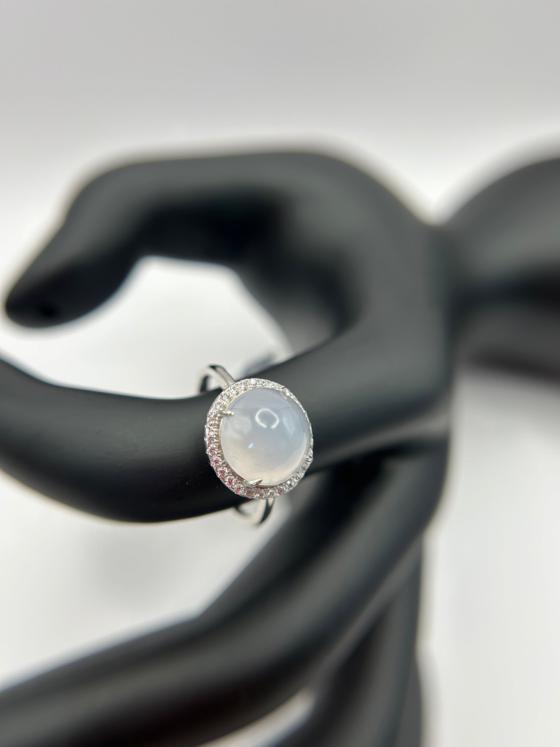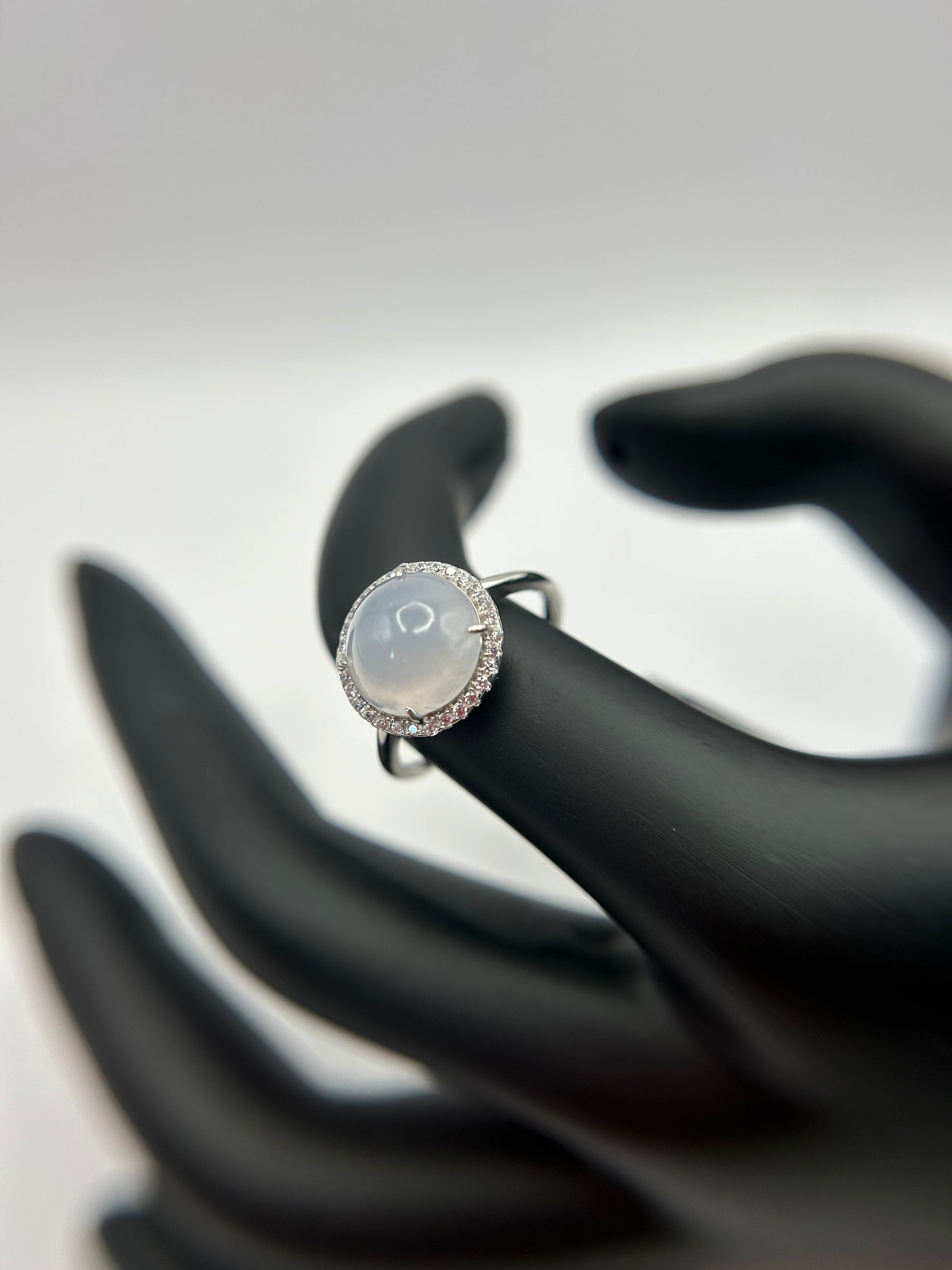 This is a Grade A Burma white cabochon jadeite with Cubic Zirconia sterling silver adjustable ring. The jadeite cabochon size is 10.04X 10.03mm