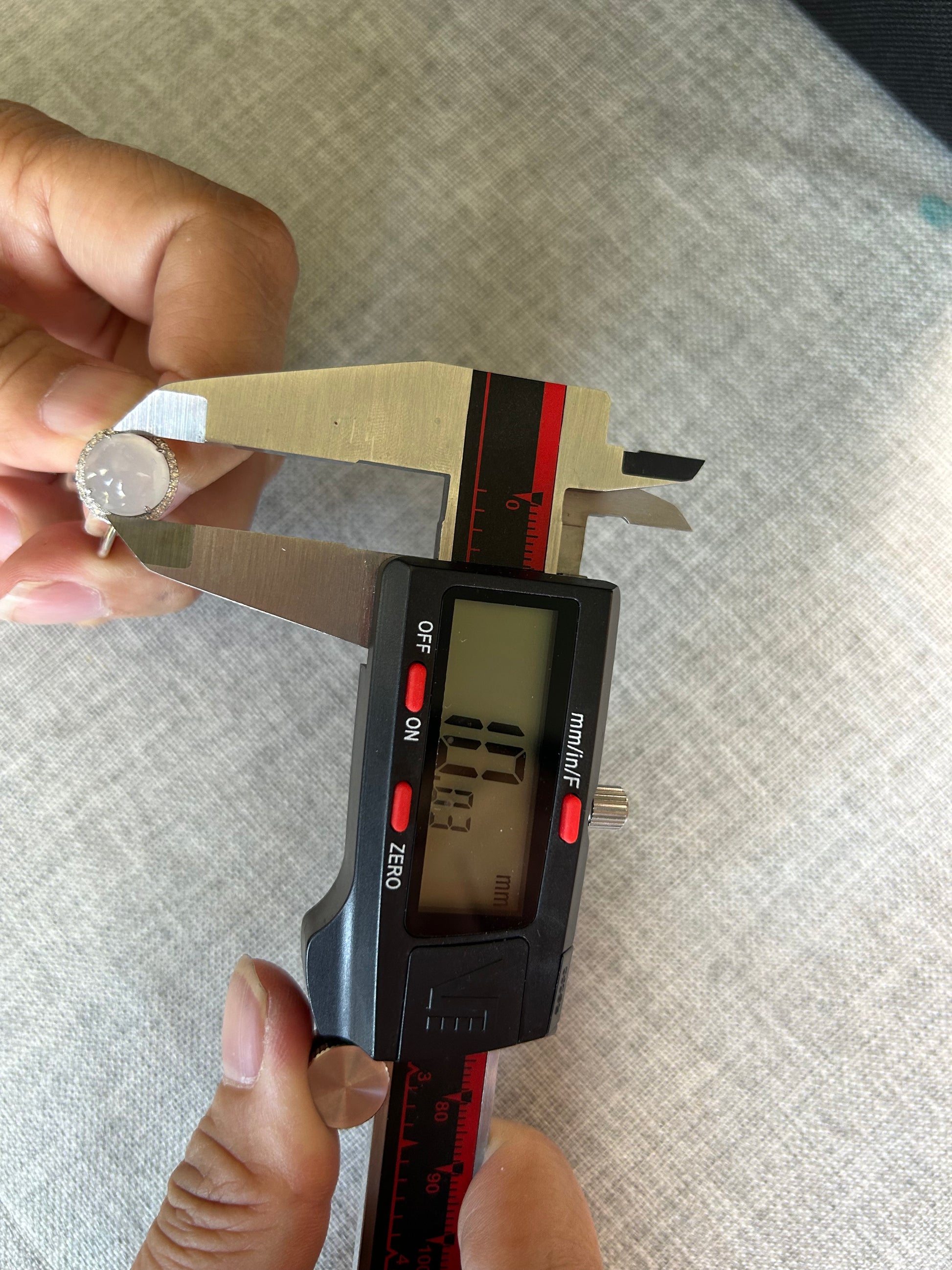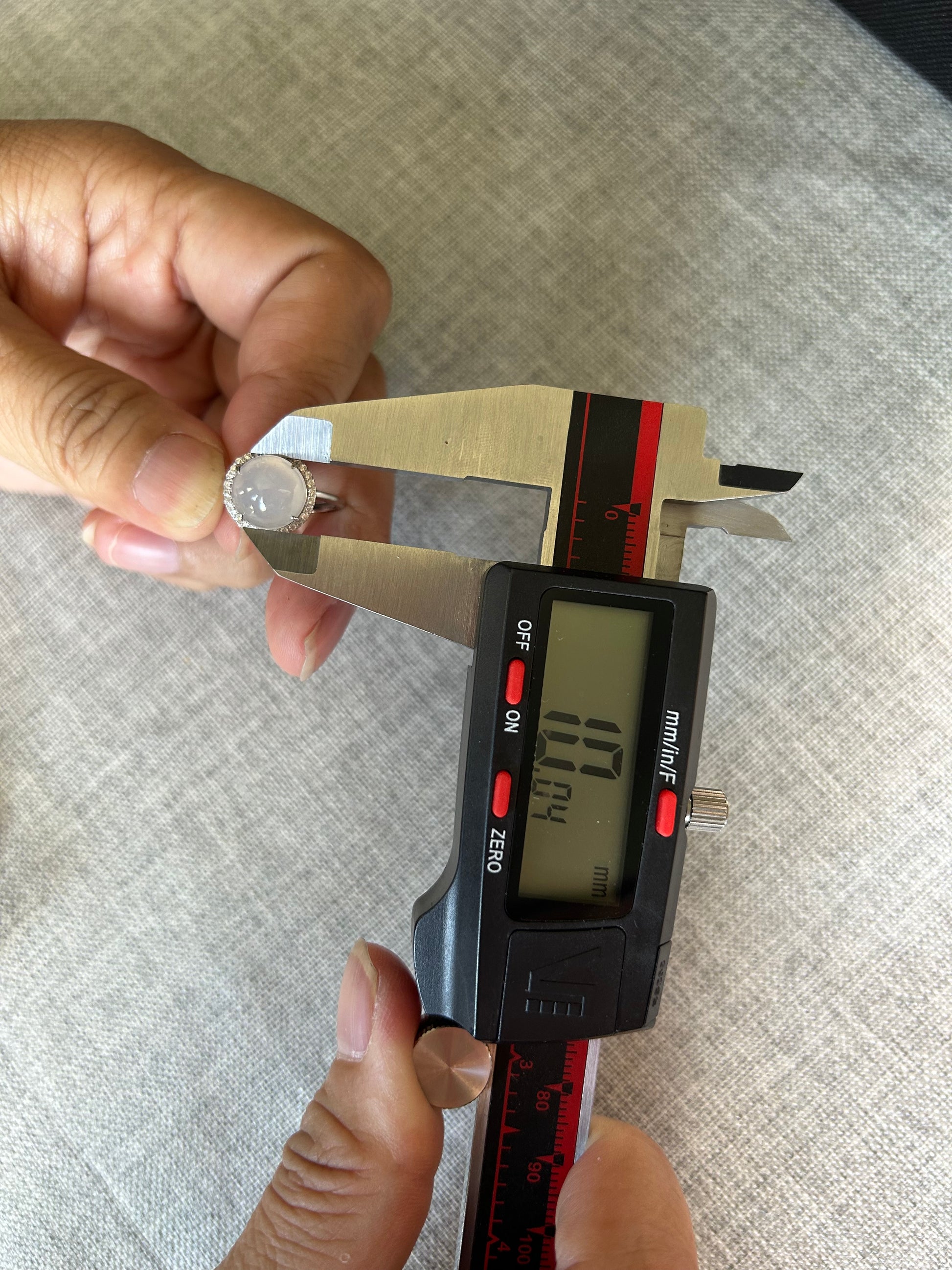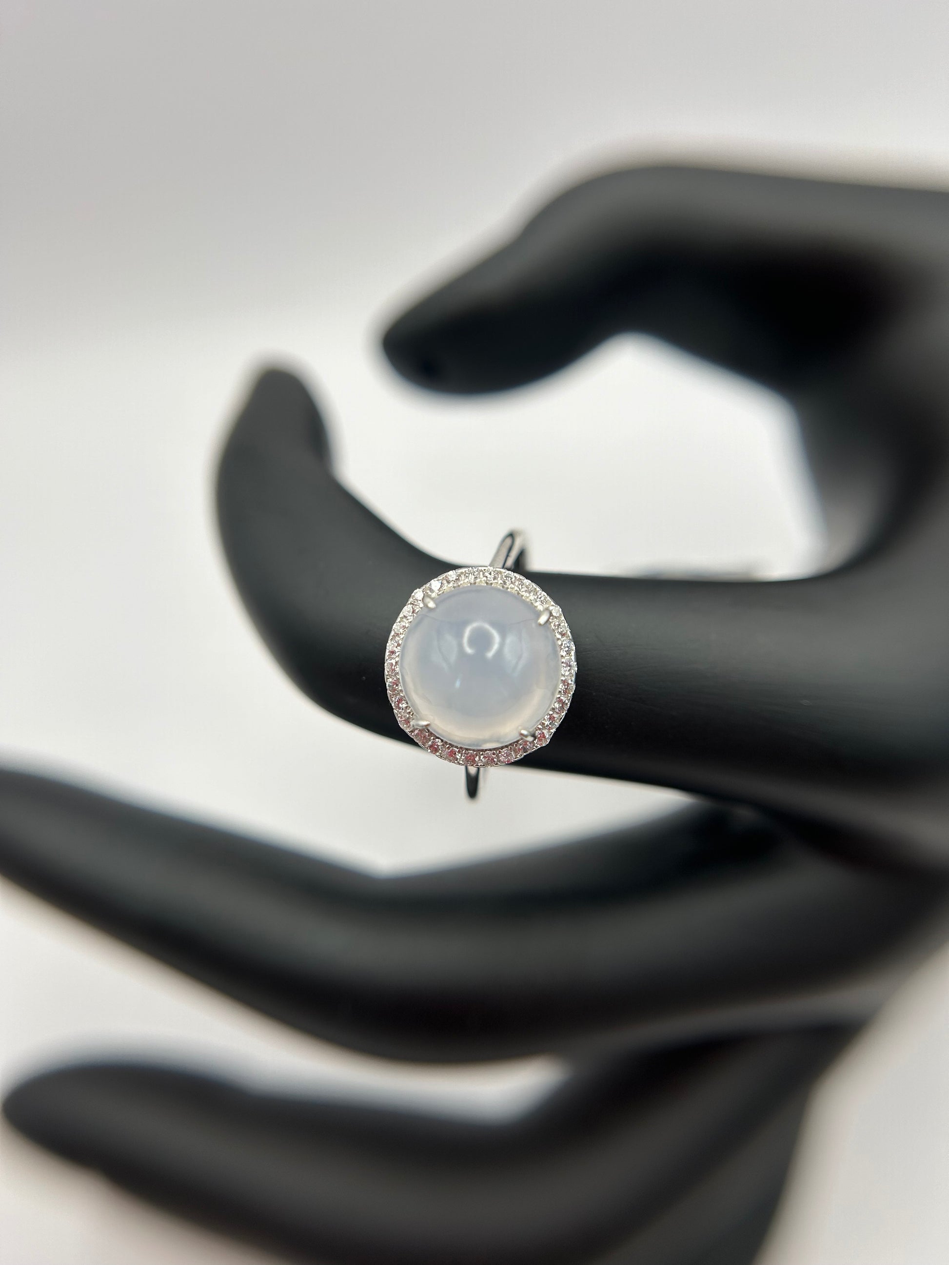 This is a Grade A Burma white cabochon jadeite with Cubic Zirconia sterling silver adjustable ring. The jadeite cabochon size is 10.04X 10.03mm