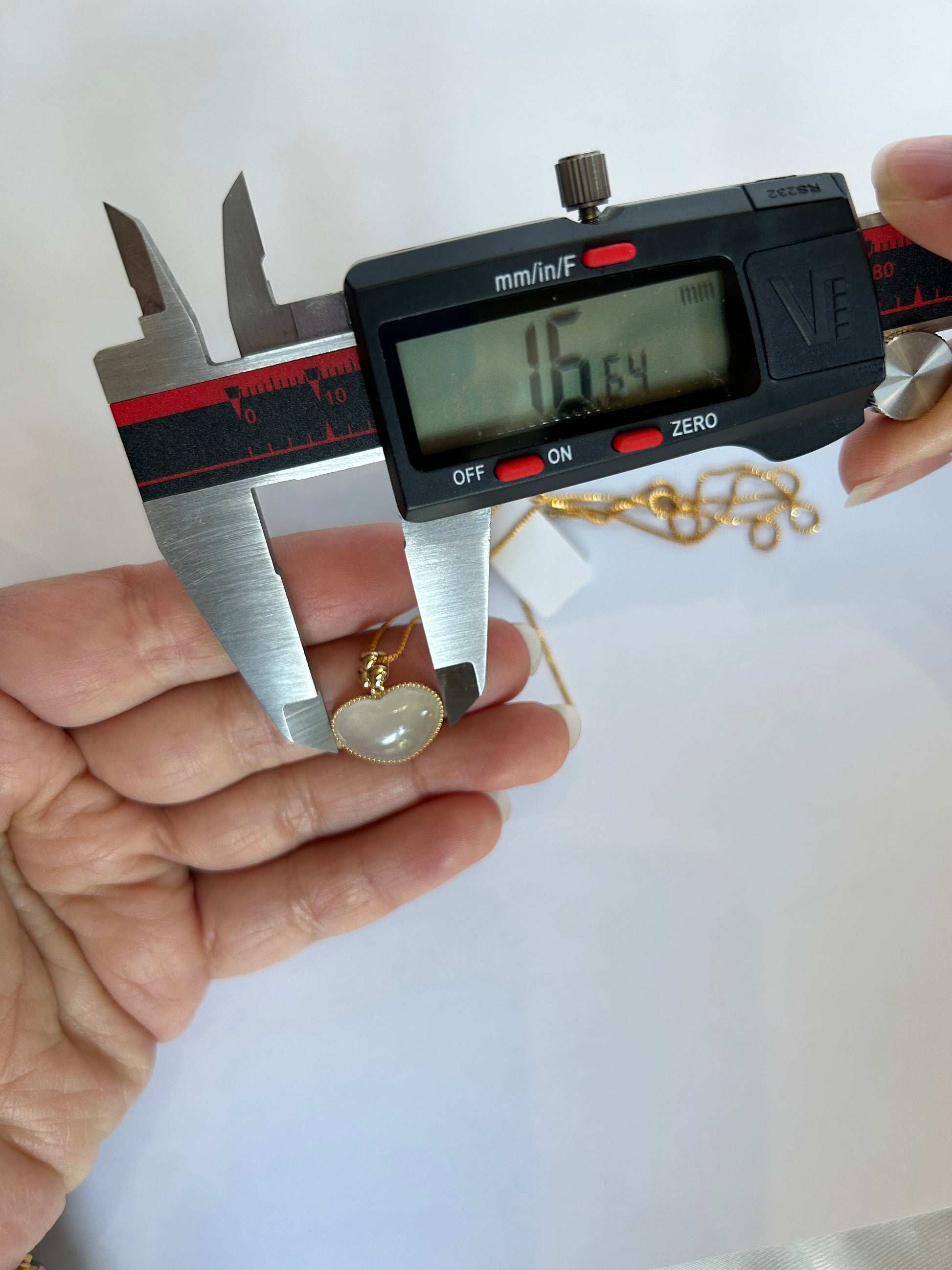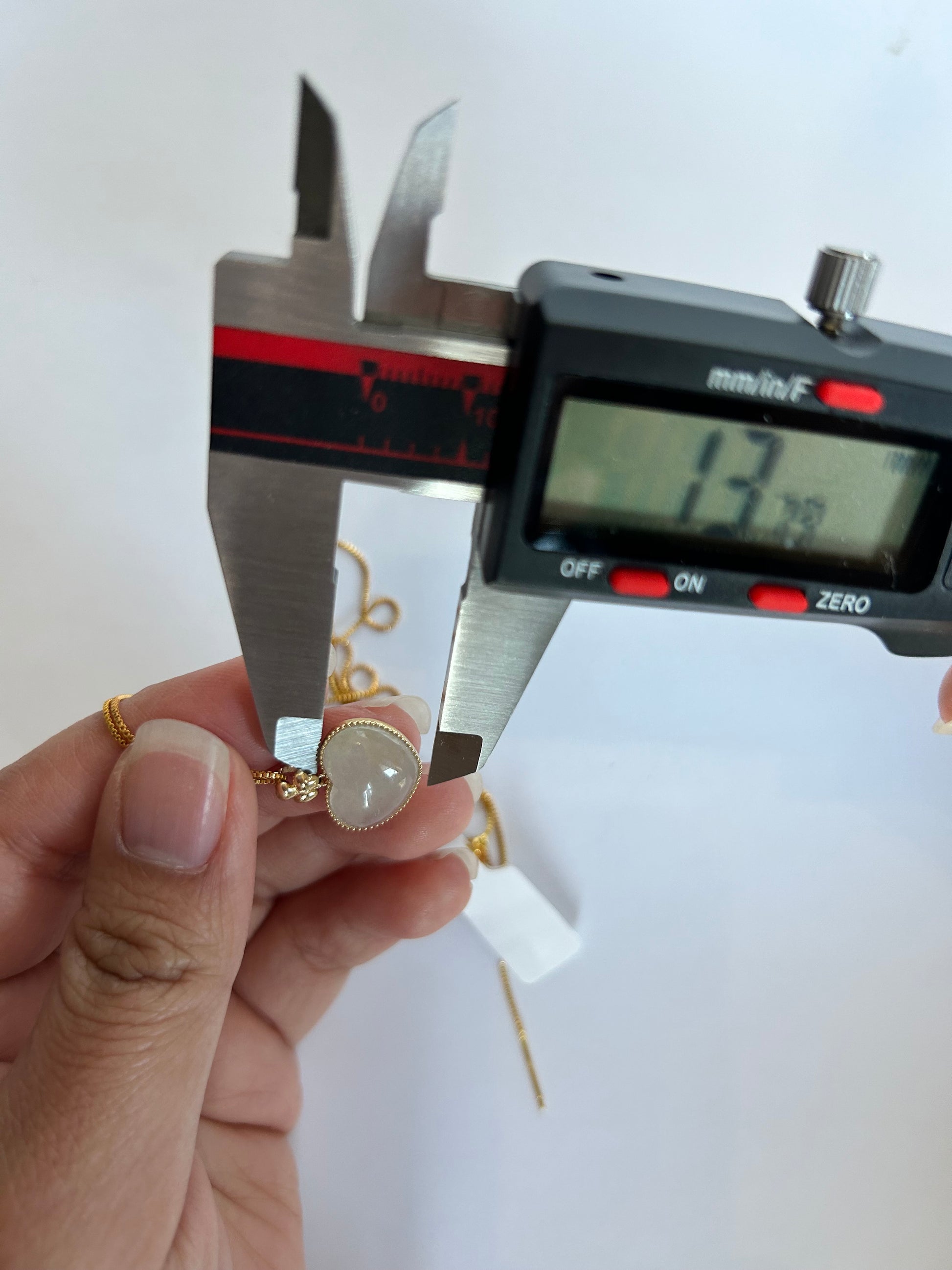 This is a natural grade A Burmese Jadeite icy white heart pendant with 18K yellow gold mounted. With a nice size height:13.19mm, width:16.64mm, thick:4.65mm.