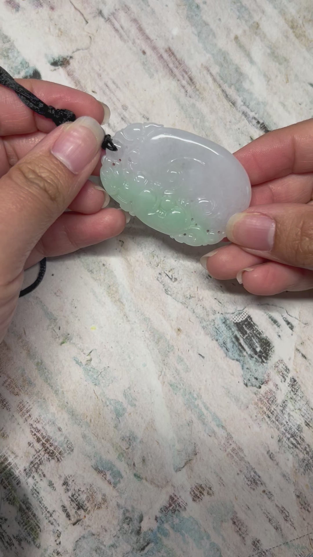This pendant is translucent, and have some light green and white color. It is hand carved on both sides. Height:52.95mm width:35.43 mm thick:7.36mm