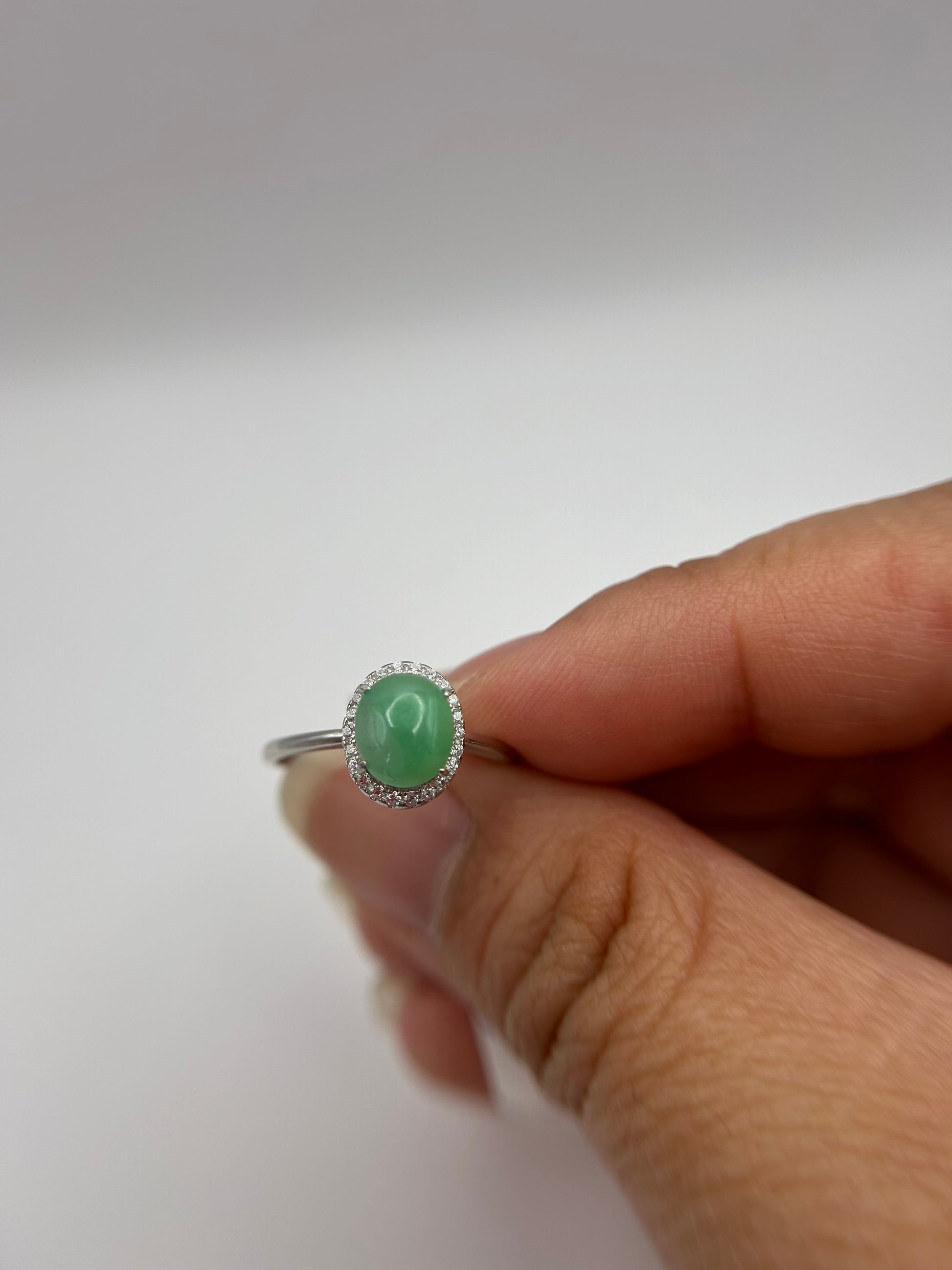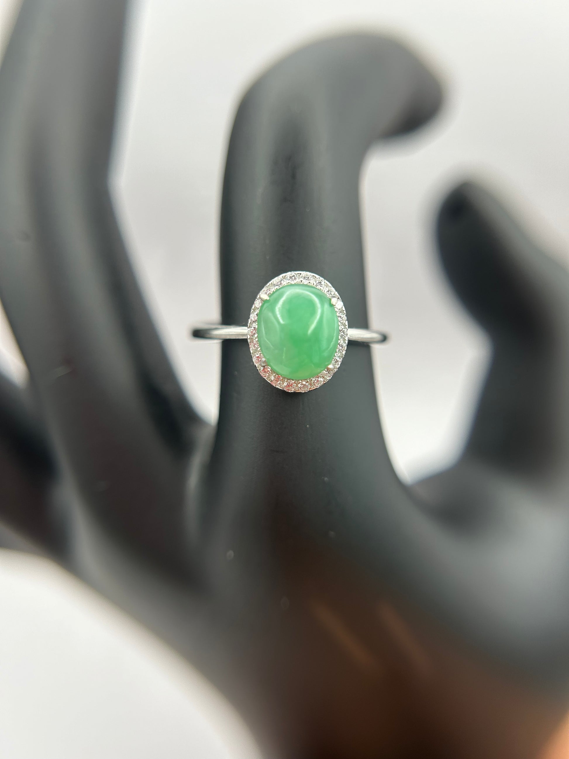Natural grade A Burmese Green Jadeite cabochon with Cubic Zirconia Silver Ring