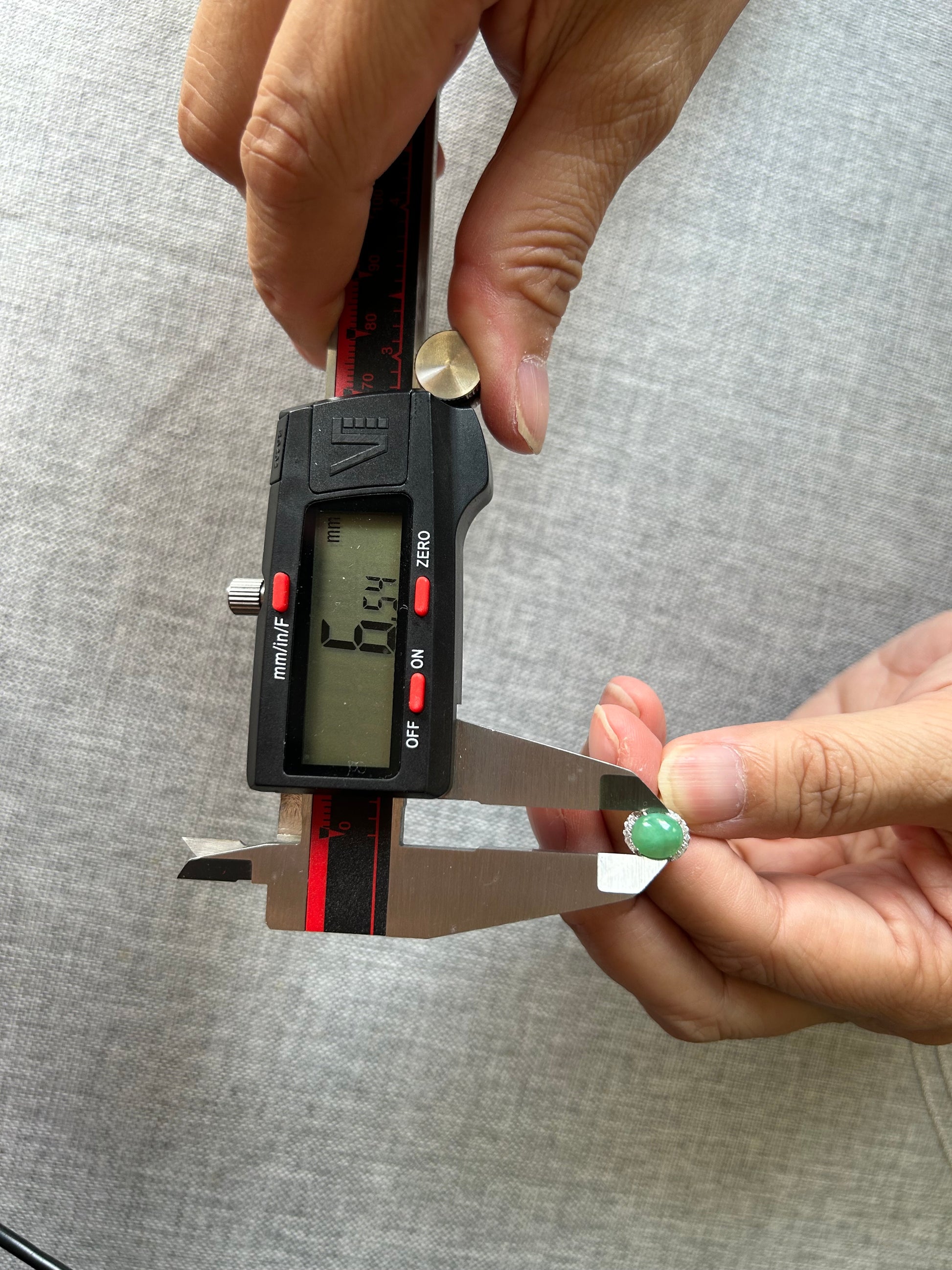 This is a Grade A Burma Green cabochon jadeite with Cubic Zirconia sterling silver adjustable ring. The jadeite cabochon size is 7.65X 6.54mm
