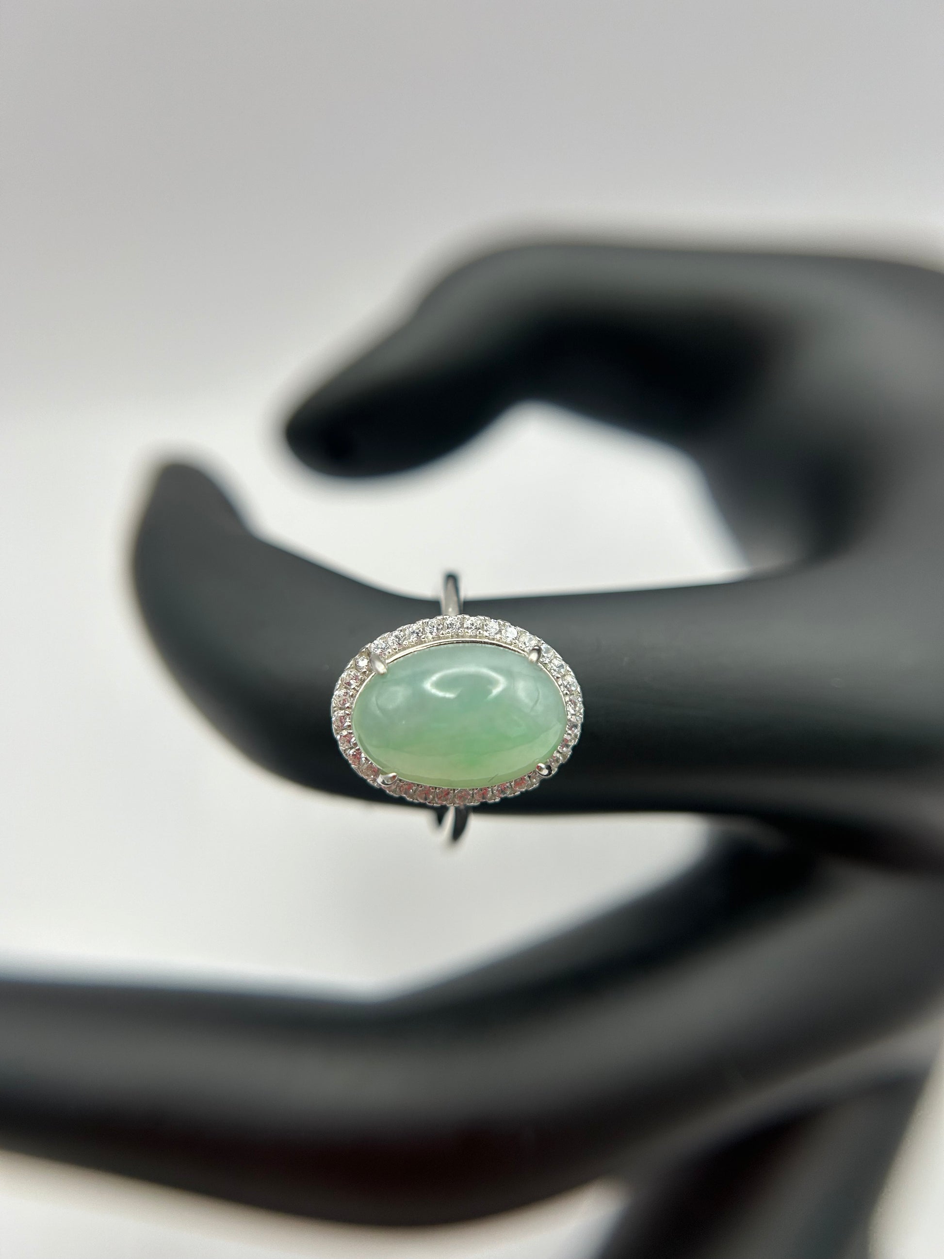 This is a Grade A Burma Green cabochon jadeite with Cubic Zirconia sterling silver adjustable ring. The jadeite cabochon size is 11.59X 8.4mm