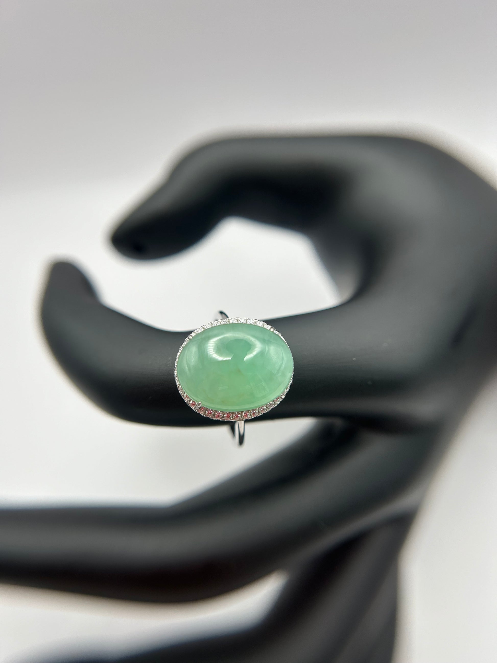 Natural grade A Burmese Icy Green Jadeite cabochon with Cubic Zirconia Silver Ring