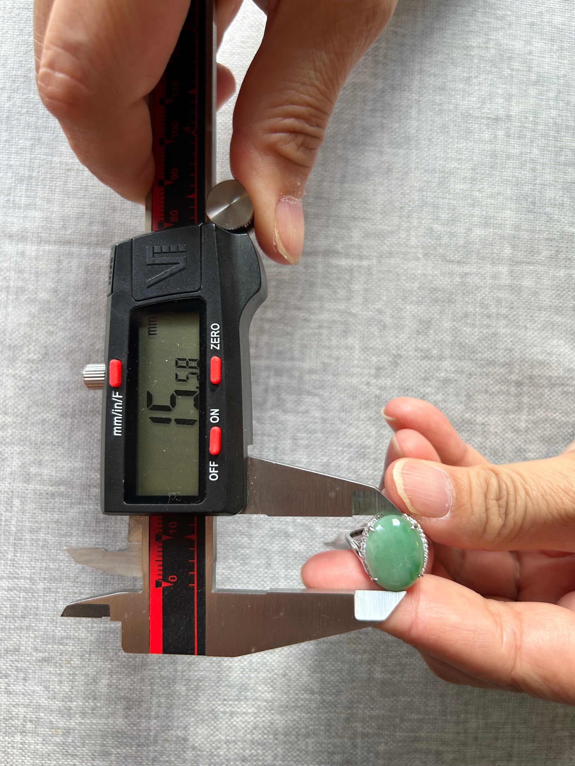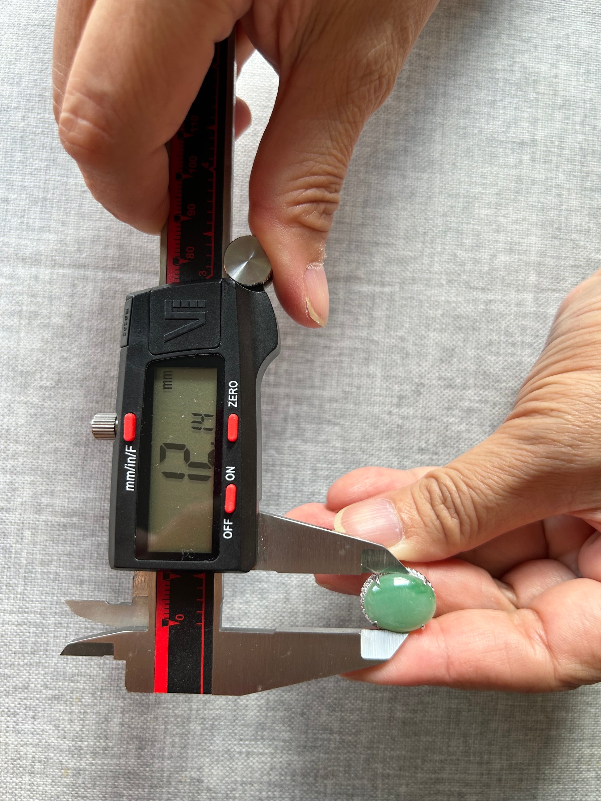 This is a Grade A Burma Green cabochon jadeite with Cubic Zirconia sterling silver adjustable ring. The jadeite cabochon size is 14.8X 12.08mm