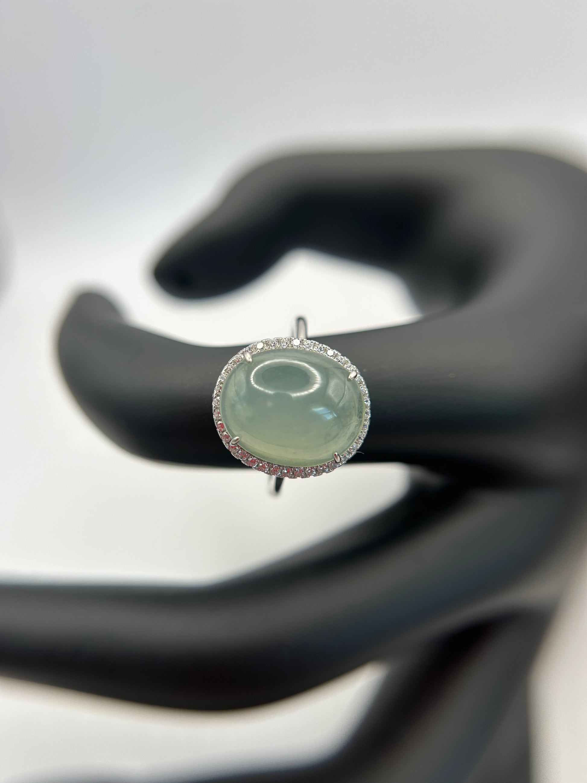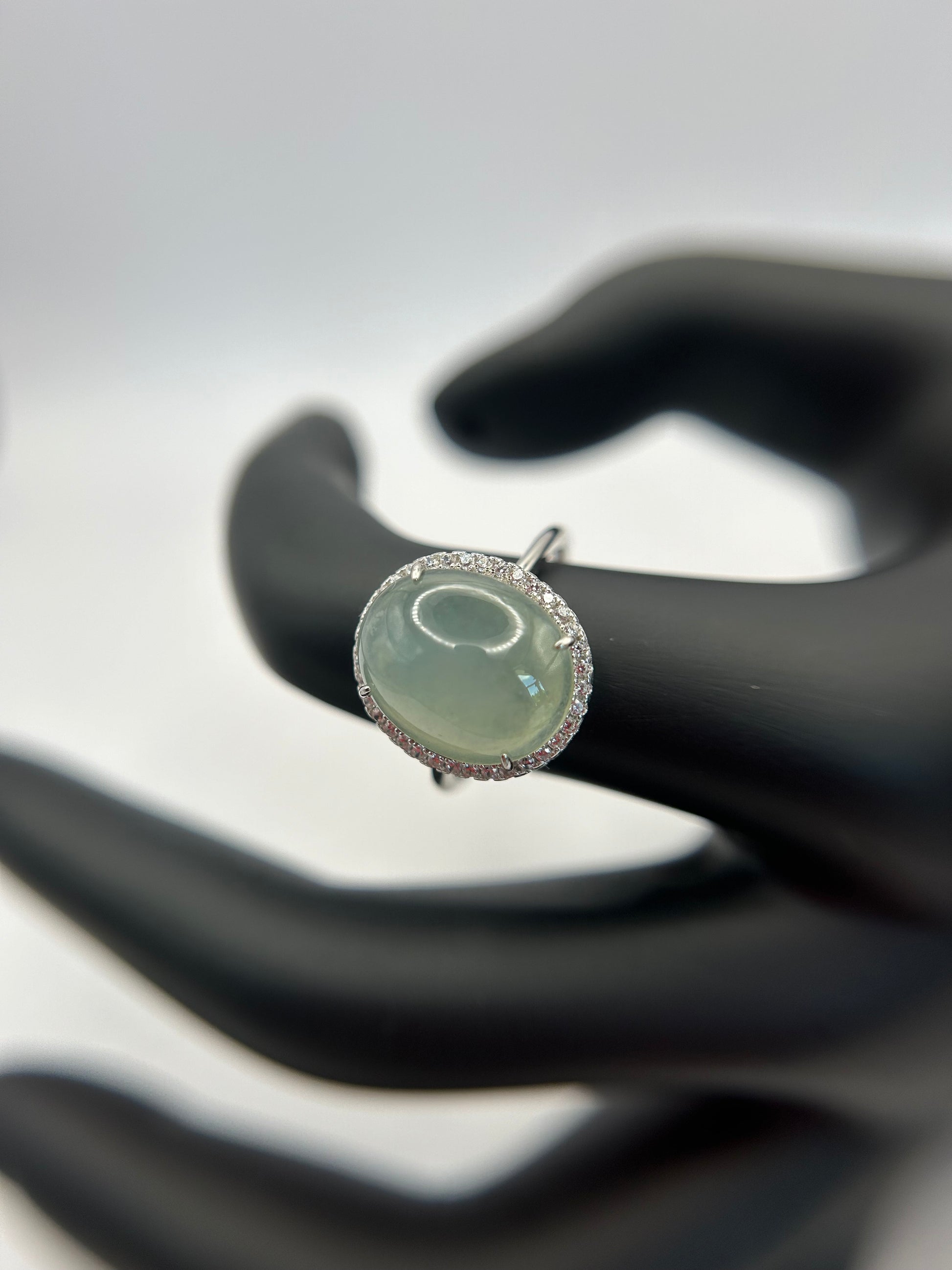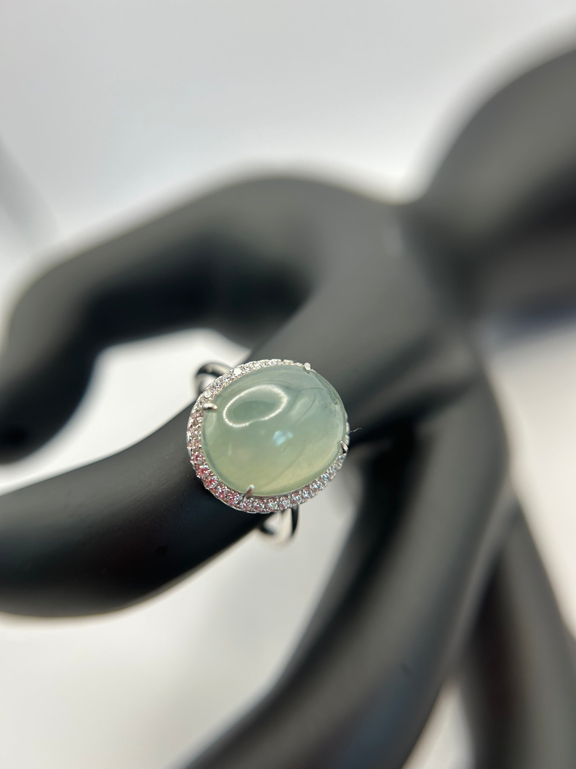 This is a Grade A Burma Icy Green cabochon jadeite with Cubic Zirconia sterling silver adjustable ring. The jadeite cabochon size is 13.43X 11.19mm