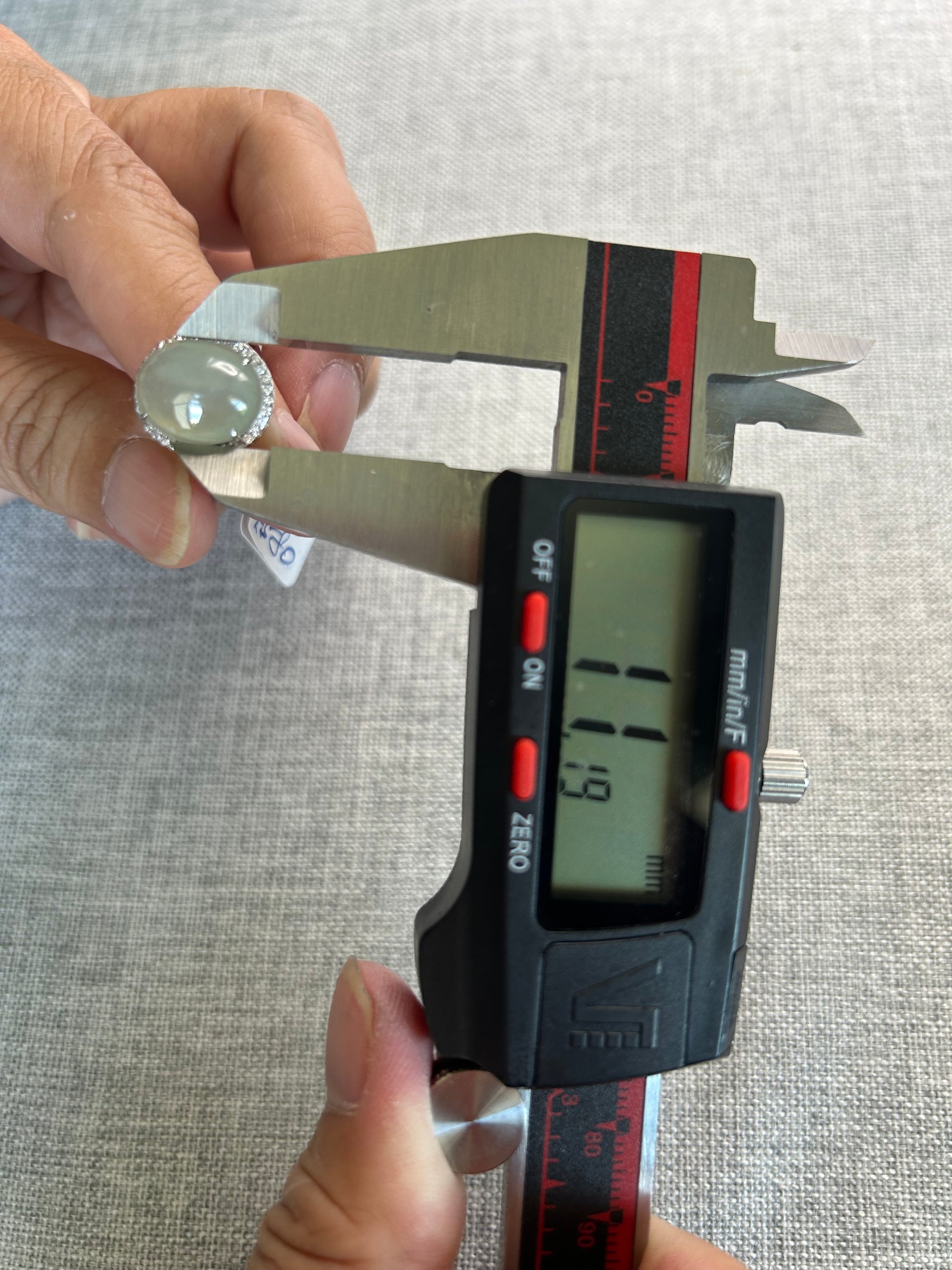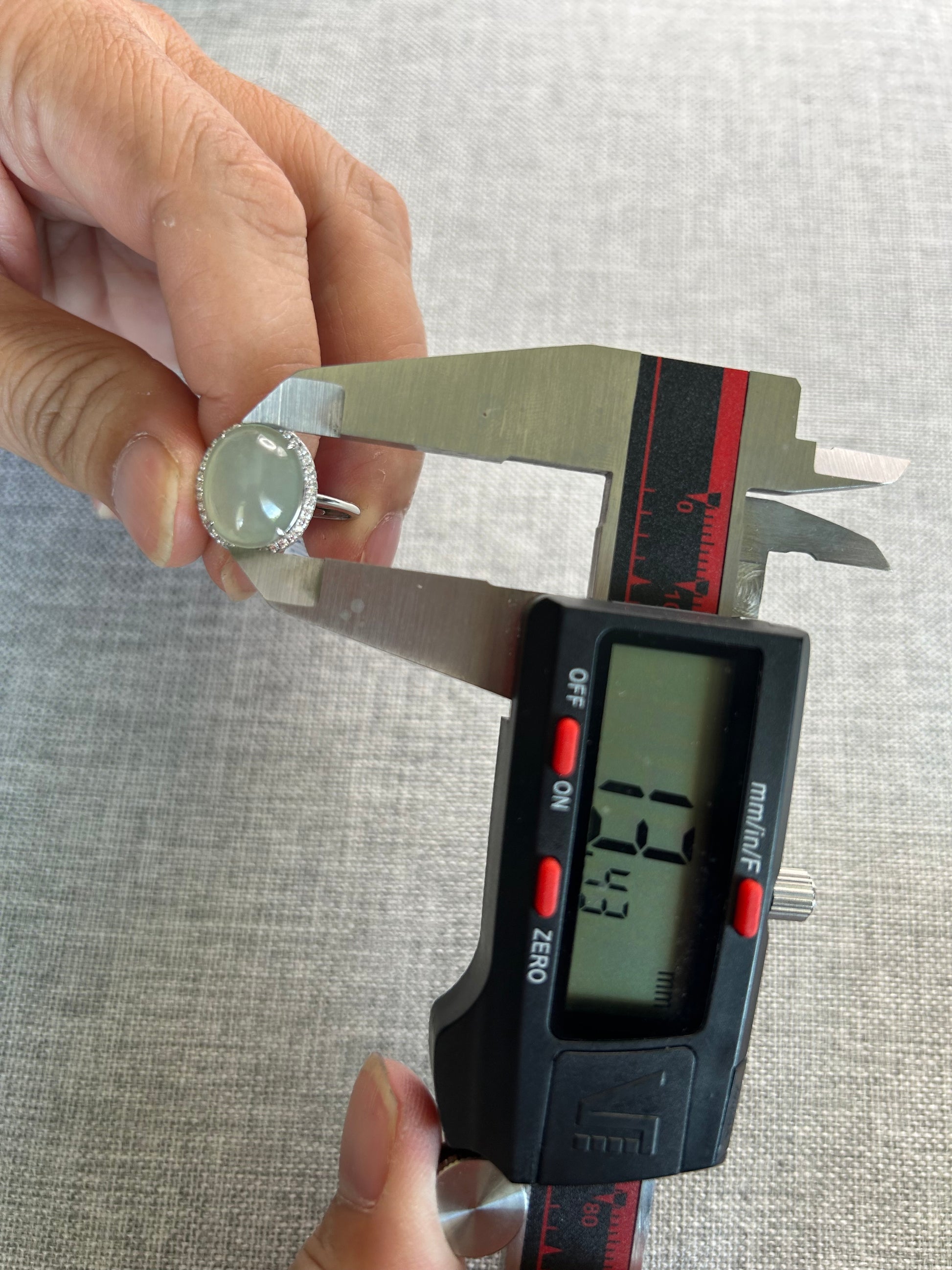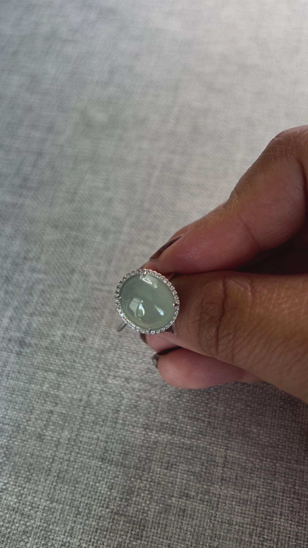 This is a Grade A Burma Icy Green cabochon jadeite with Cubic Zirconia sterling silver adjustable ring. The jadeite cabochon size is 13.43X 11.19mm