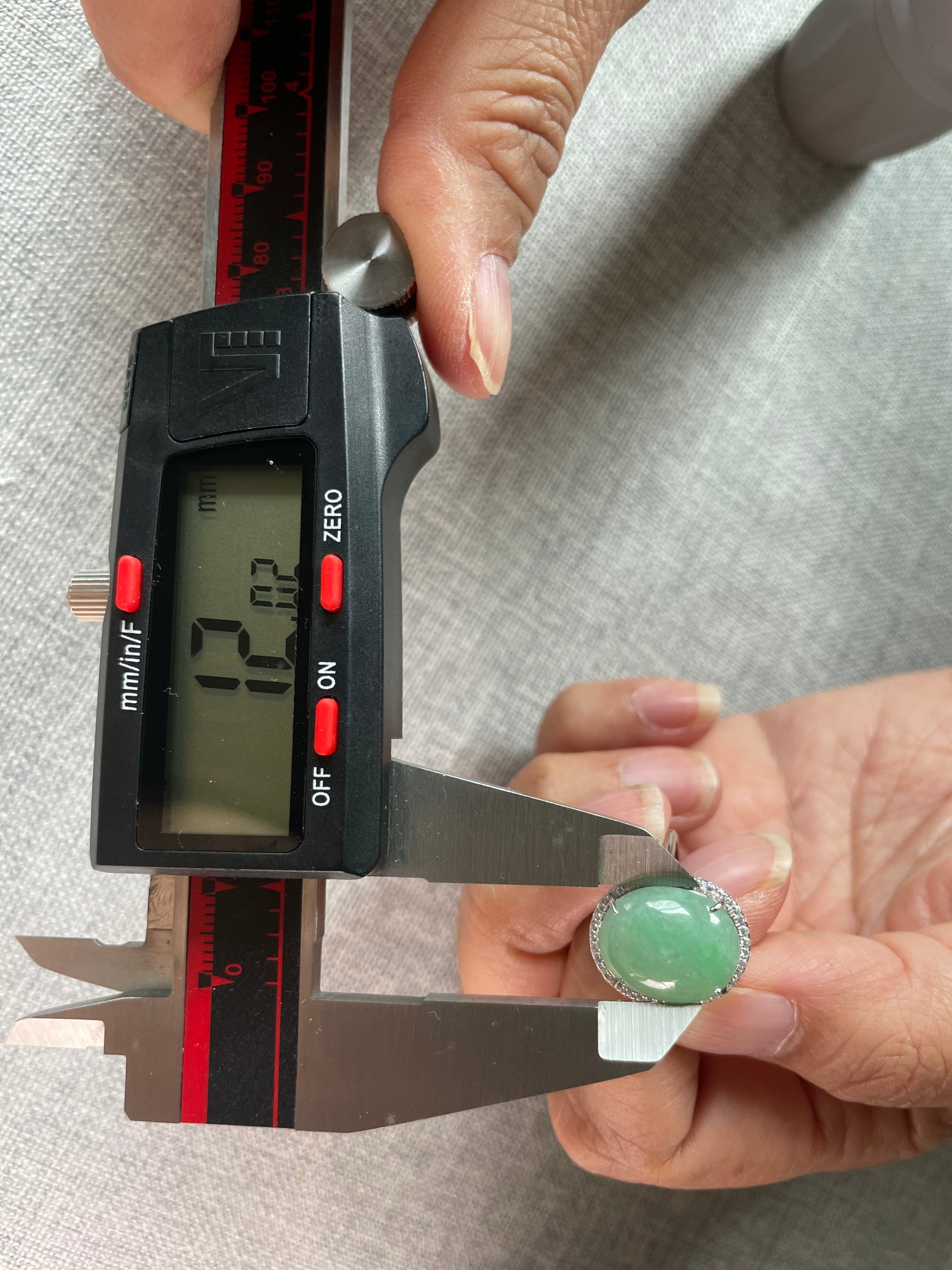 This is a Grade A Burma Icy Green cabochon jadeite with Cubic Zirconia sterling silver adjustable ring. The jadeite cabochon size is 14.7mmX 12.02mm