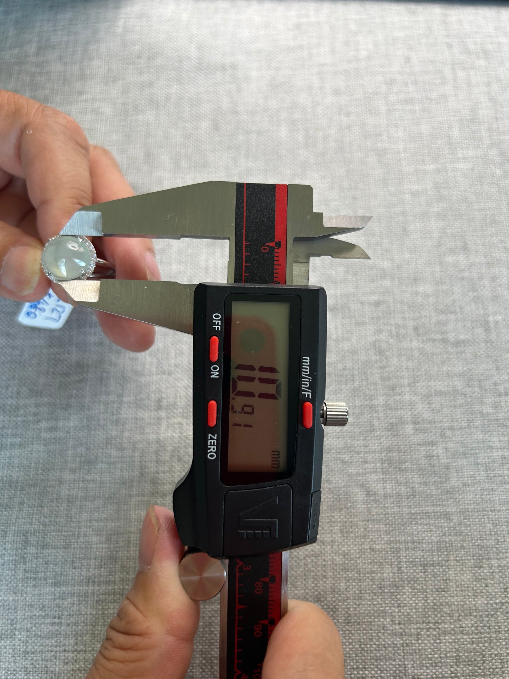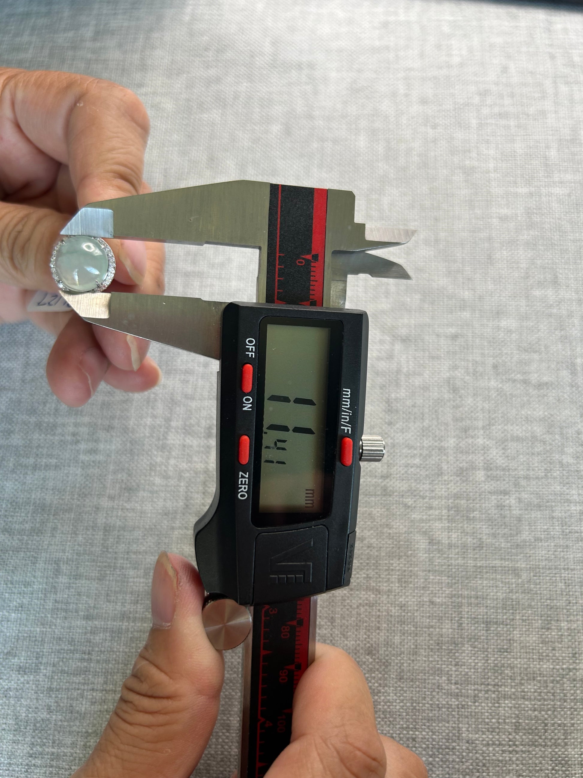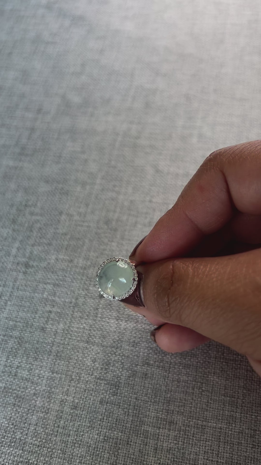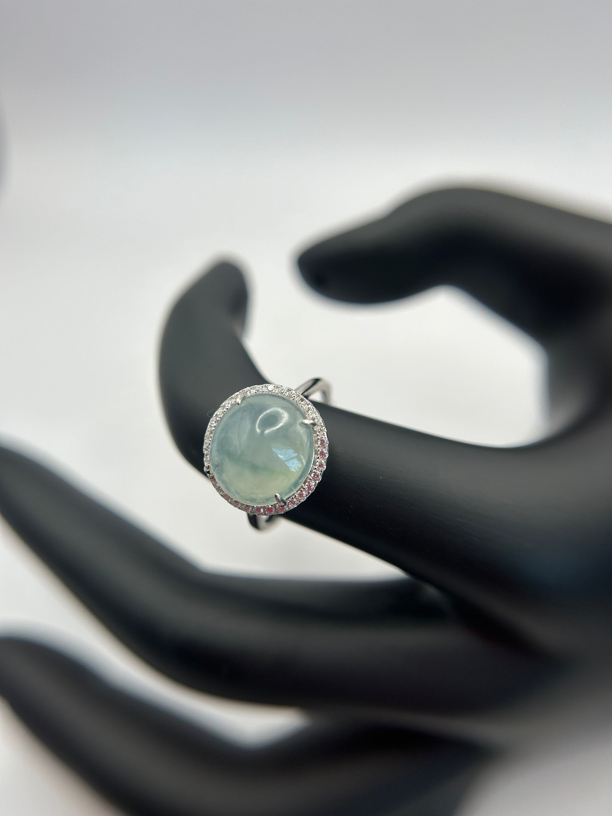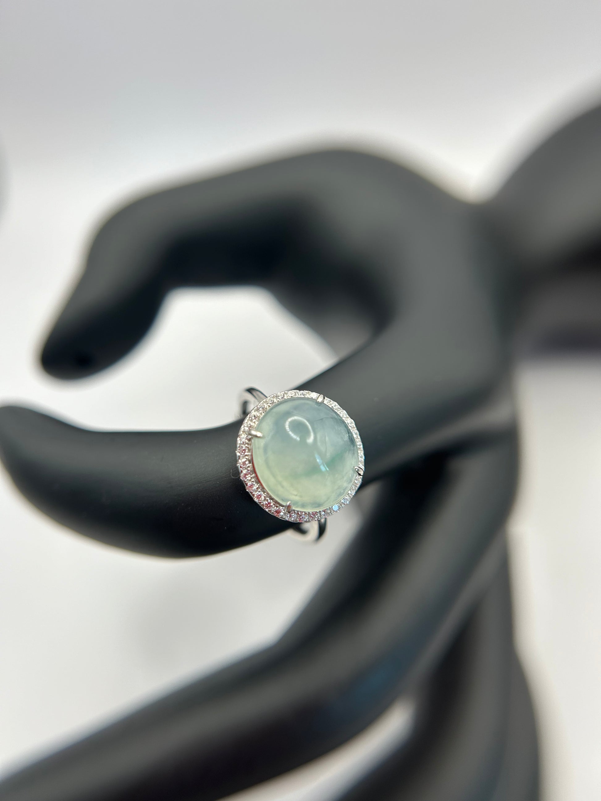 This is a Grade A Burma Icy Green cabochon jadeite with Cubic Zirconia sterling silver adjustable ring. The jadeite cabochon size is 11.41X 10.91mm