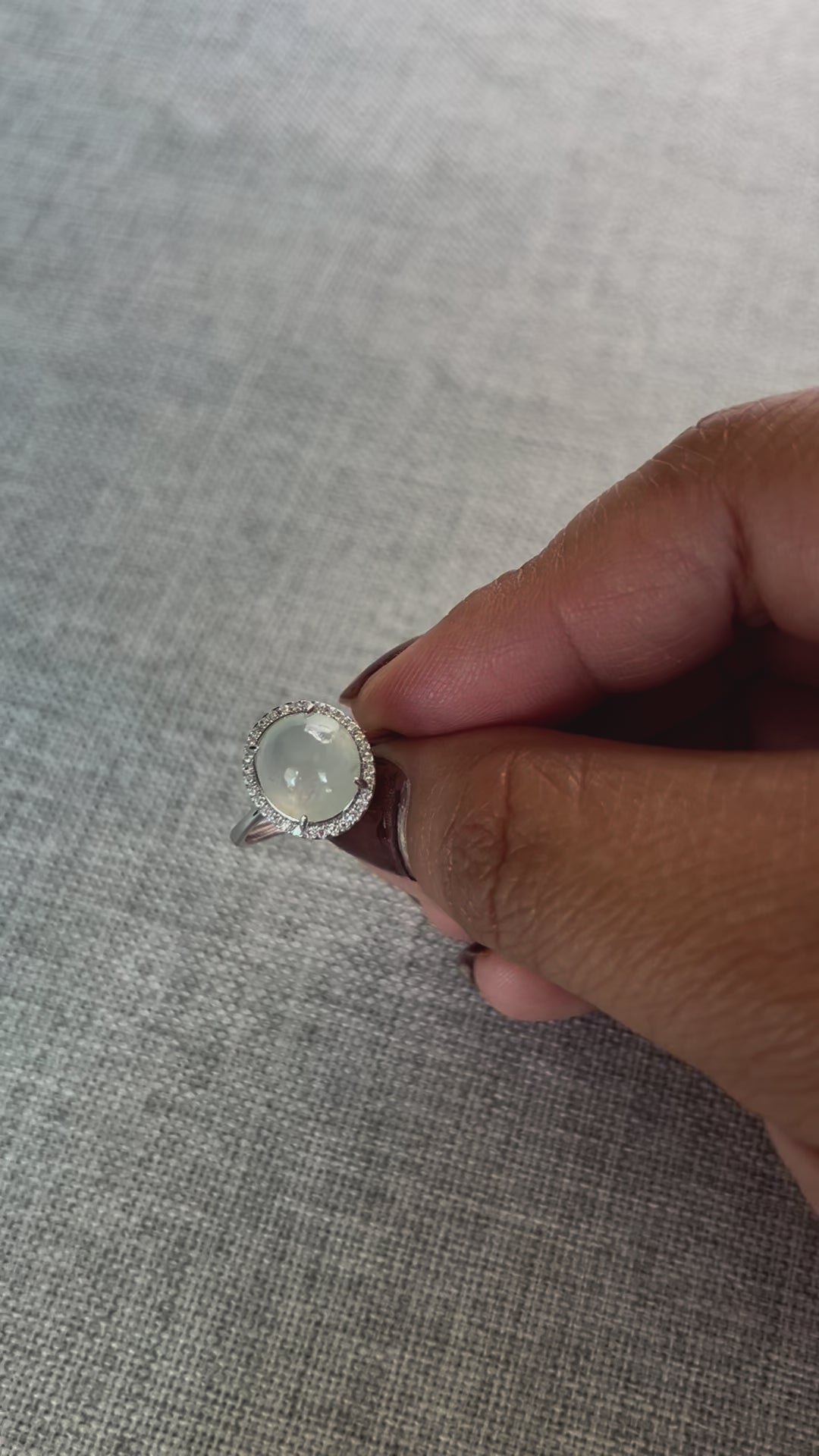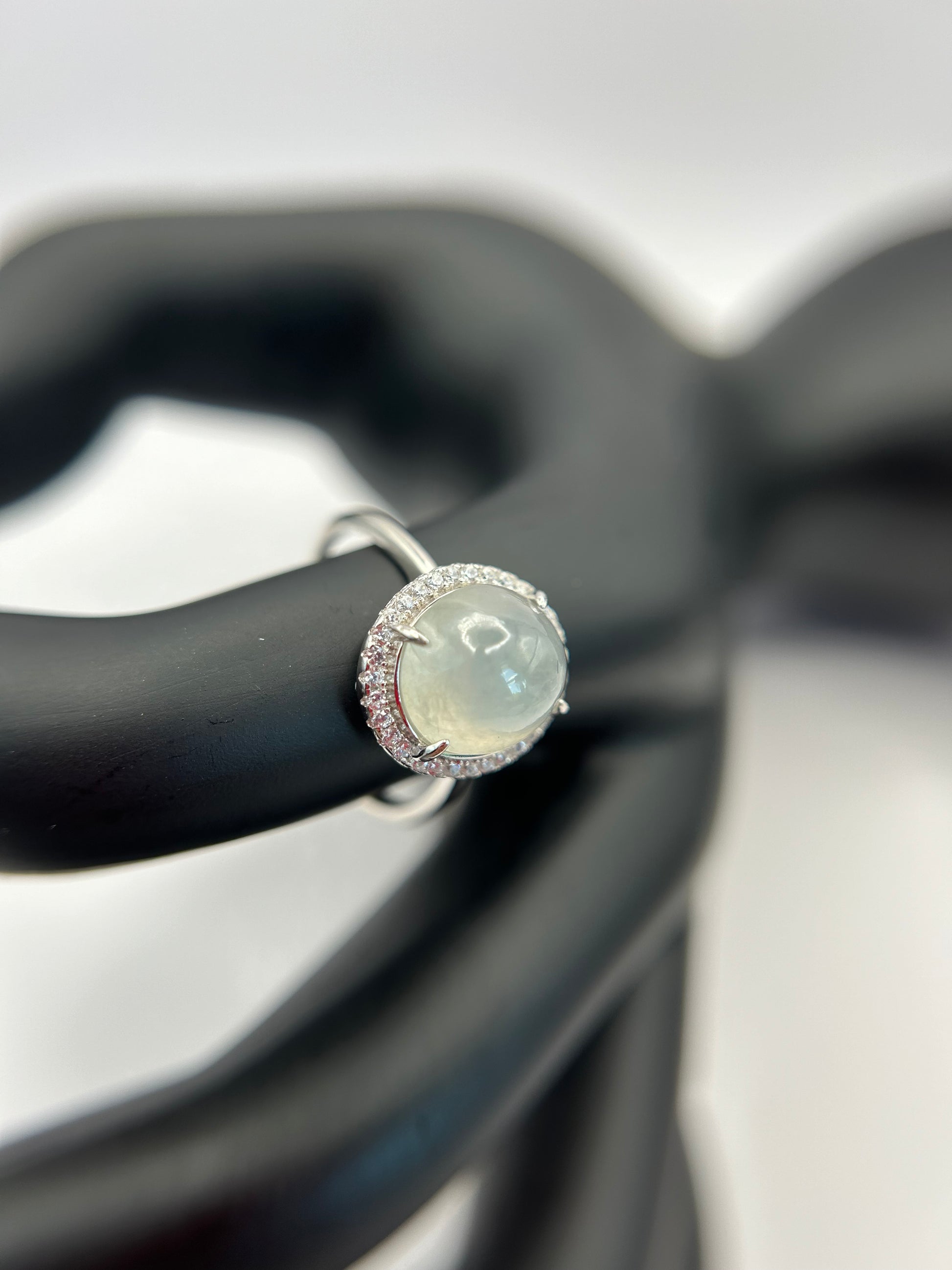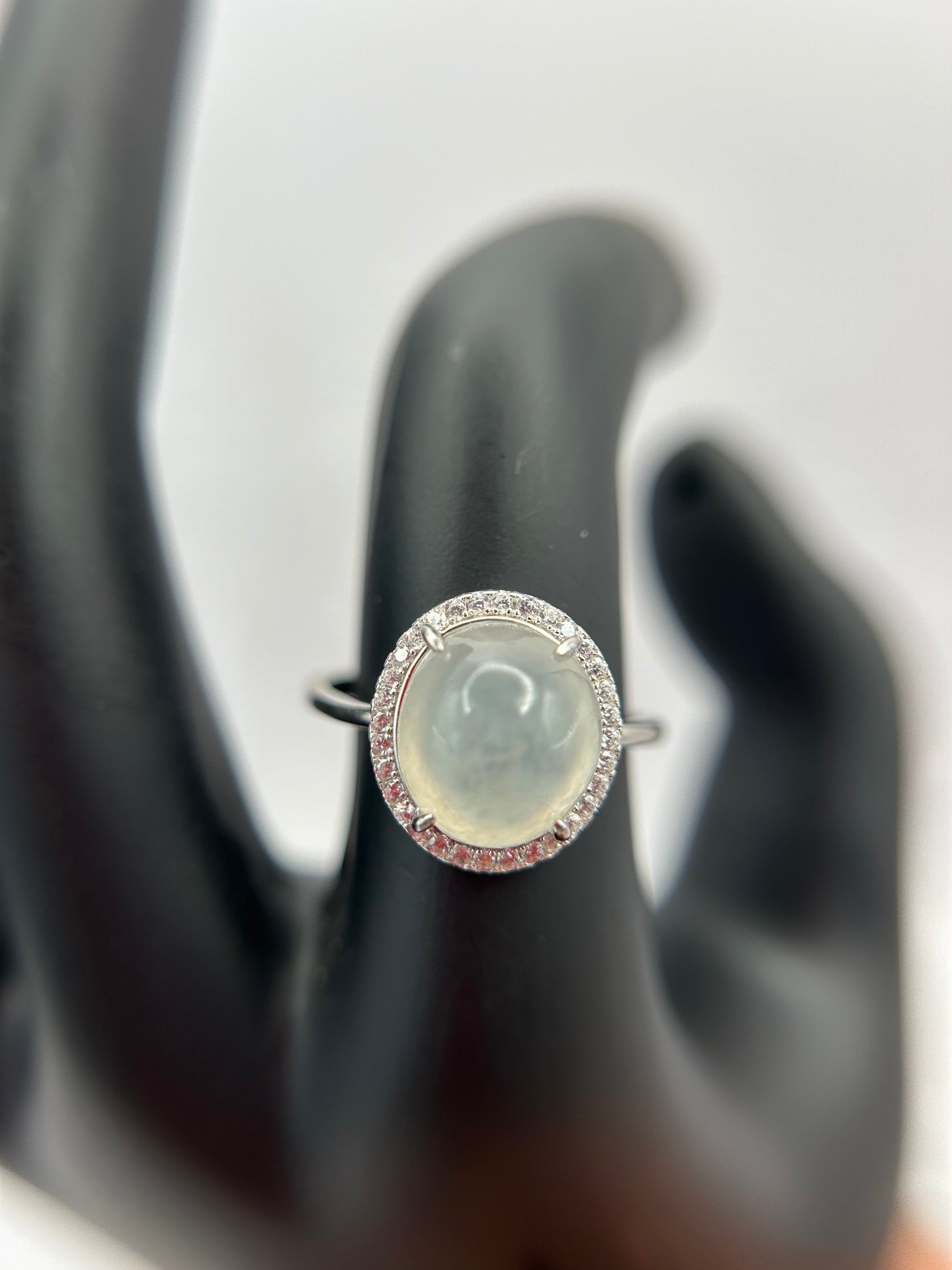 This is a Grade A Burma Icy Green cabochon jadeite with Cubic Zirconia sterling silver adjustable ring. The jadeite cabochon size is 9.98X 9.46mm