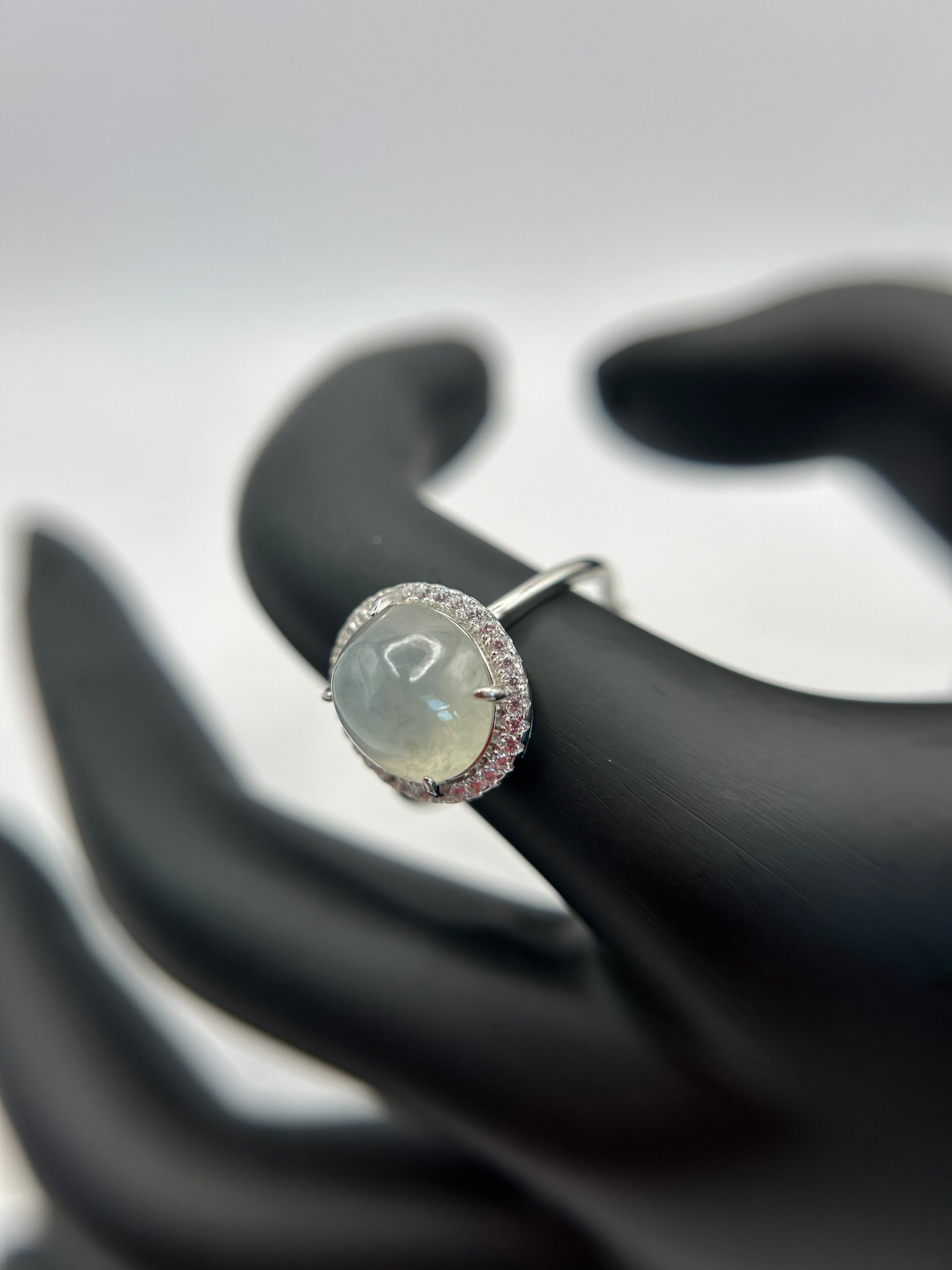 Natural grade A Burmese Icy Green Jadeite cabochon with Cubic Zirconia Silver Ring