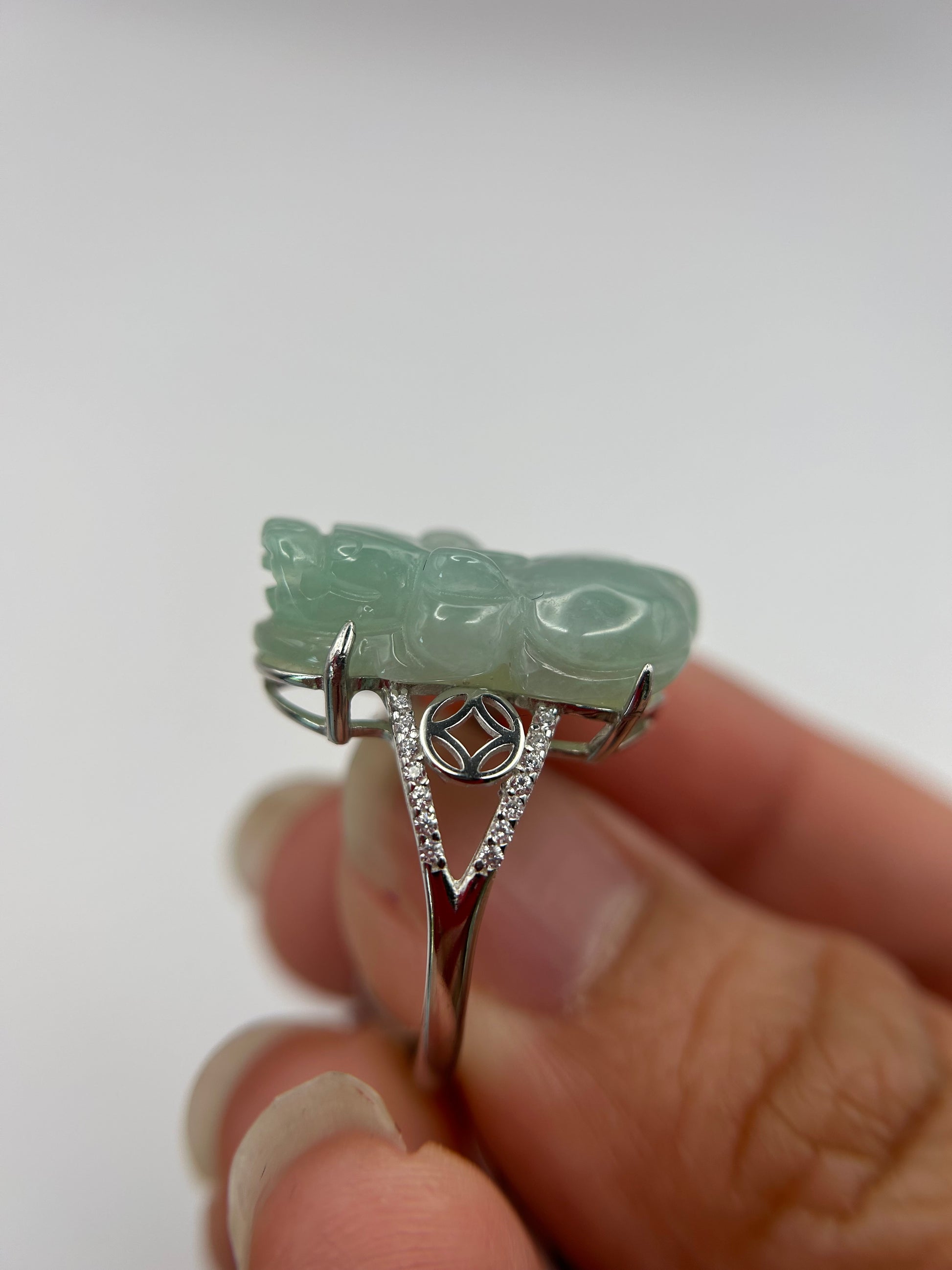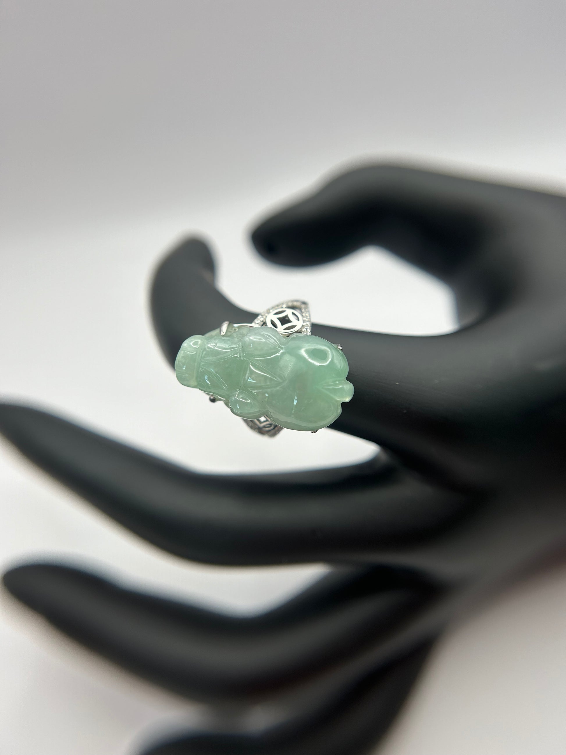 This is a Grade A Burma Green Pi Xiu jadeite with Cubic Zirconia sterling silver adjustable ring. The jadeite Pi Xiu size is 21.27X 11.83mm. Pi Xiu will help the wearer bring wealth and stay away from sickness.
