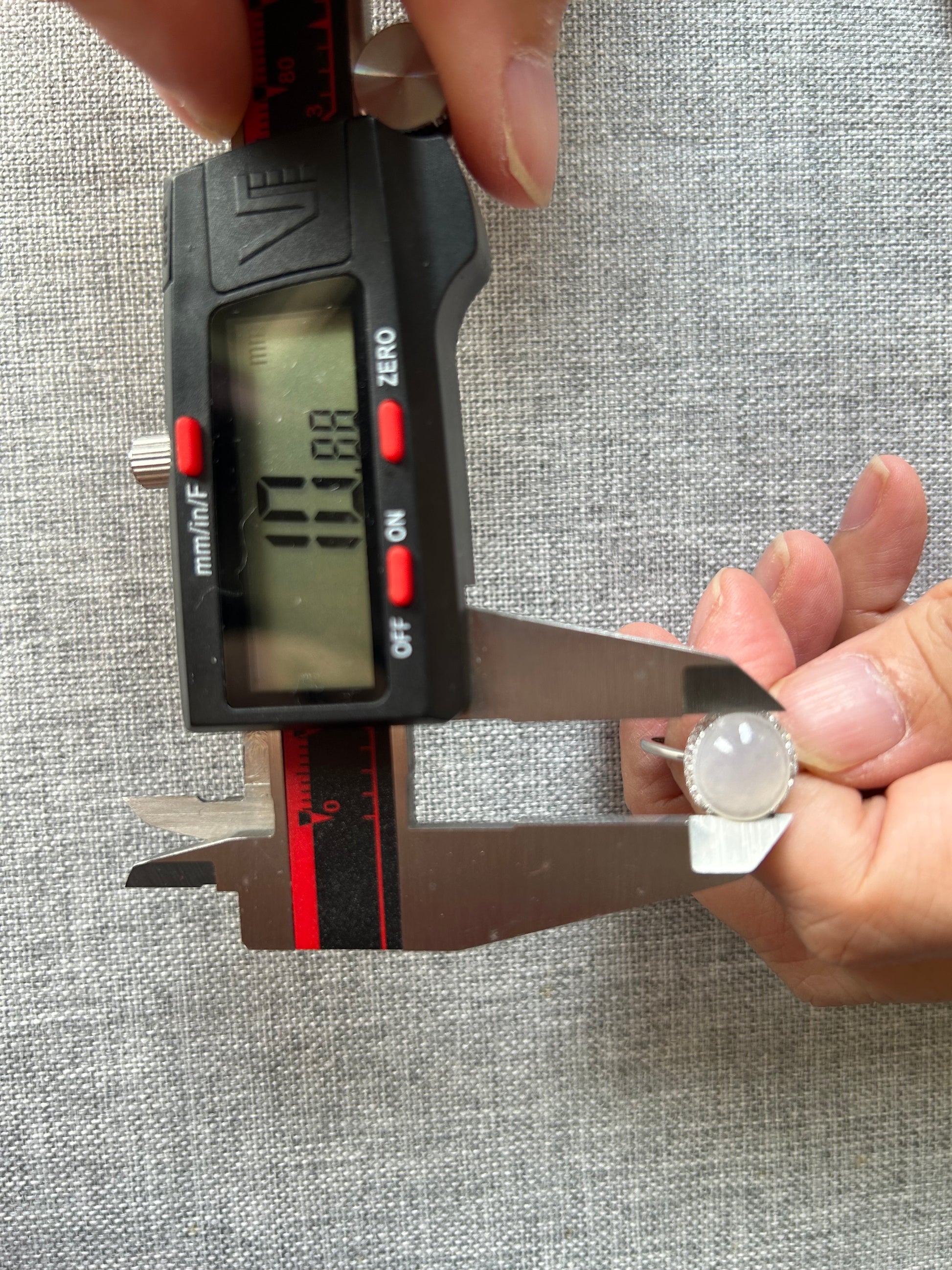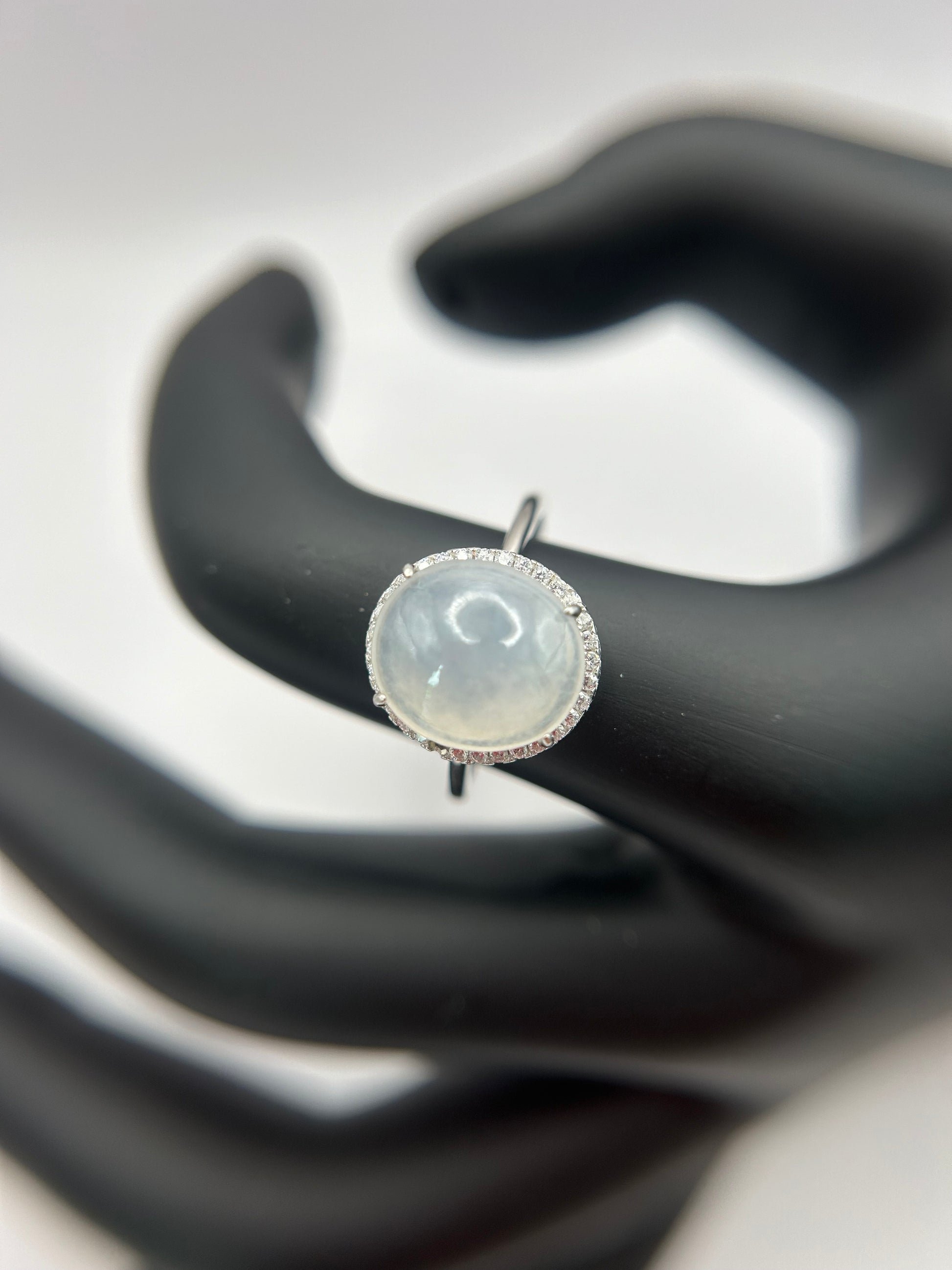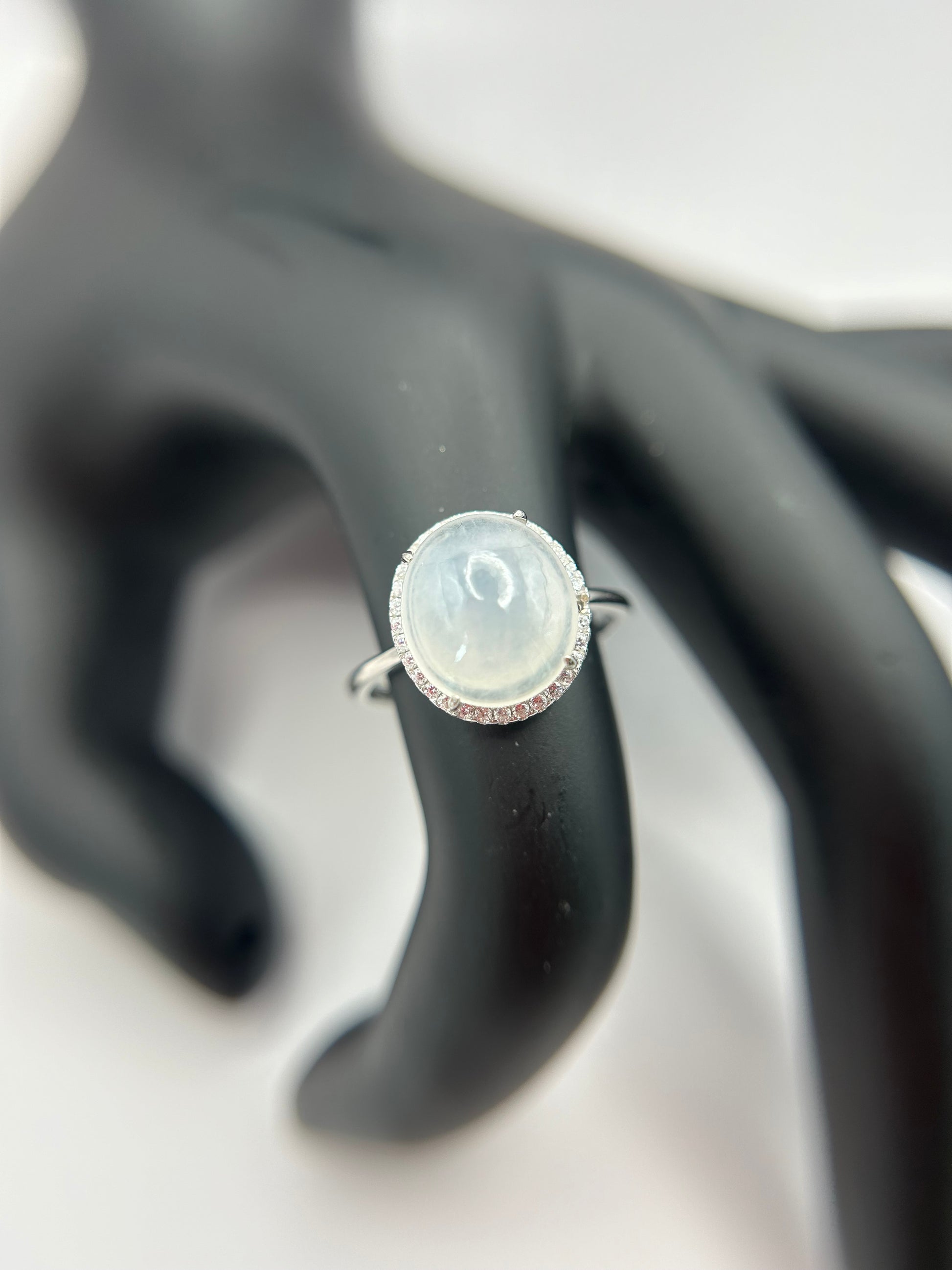 This is a Grade A Burma Icy cabochon jadeite with Cubic Zirconia sterling silver adjustable ring. The jadeite cabochon size is 10.88 X 8.92mm