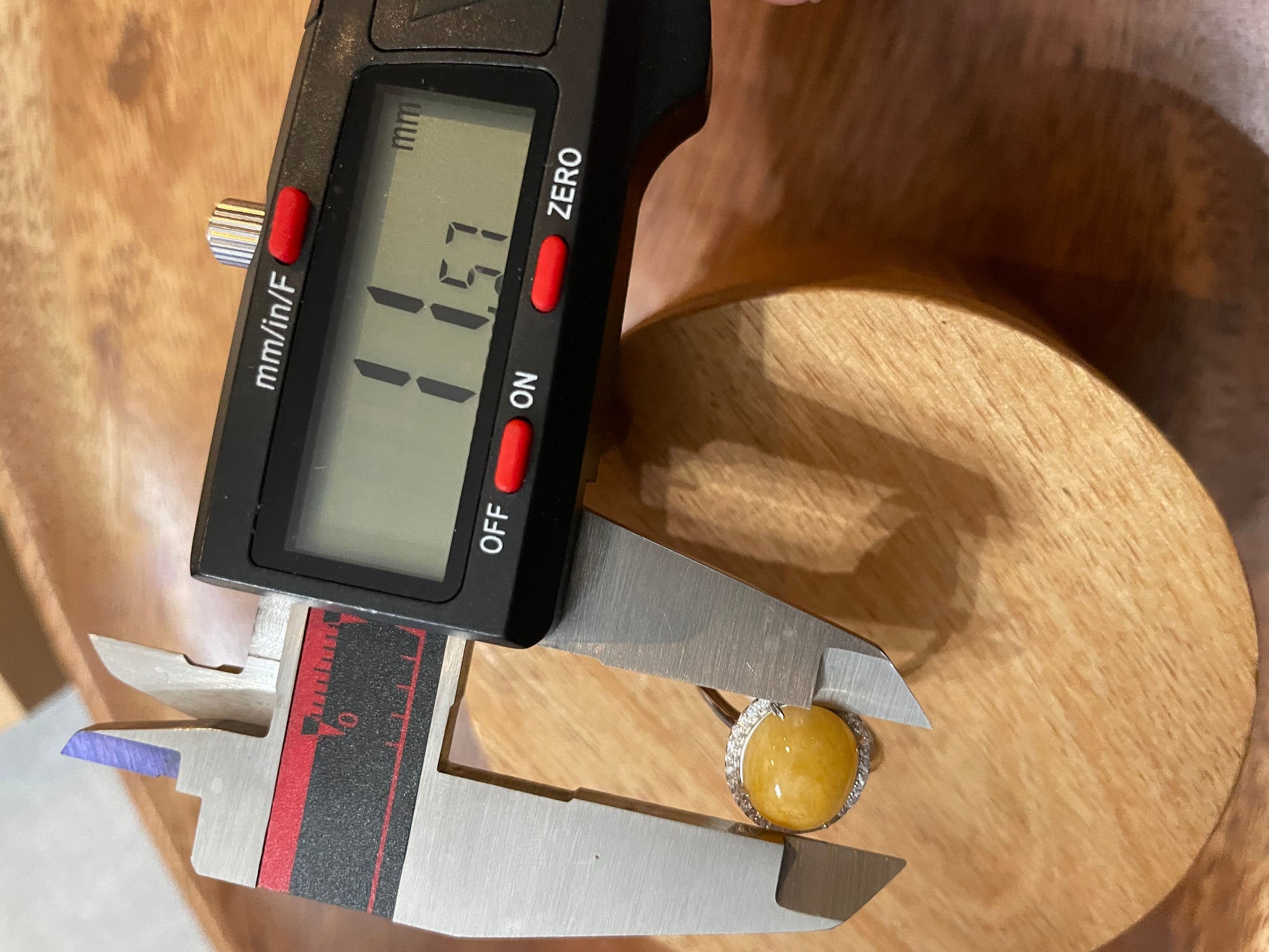 This is a Grade A Burma Icy Yellow cabochon jadeite with Cubic Zircon sterling silver adjustable ring. The jadeite cabochon size is 11.57mm X 9.67mm