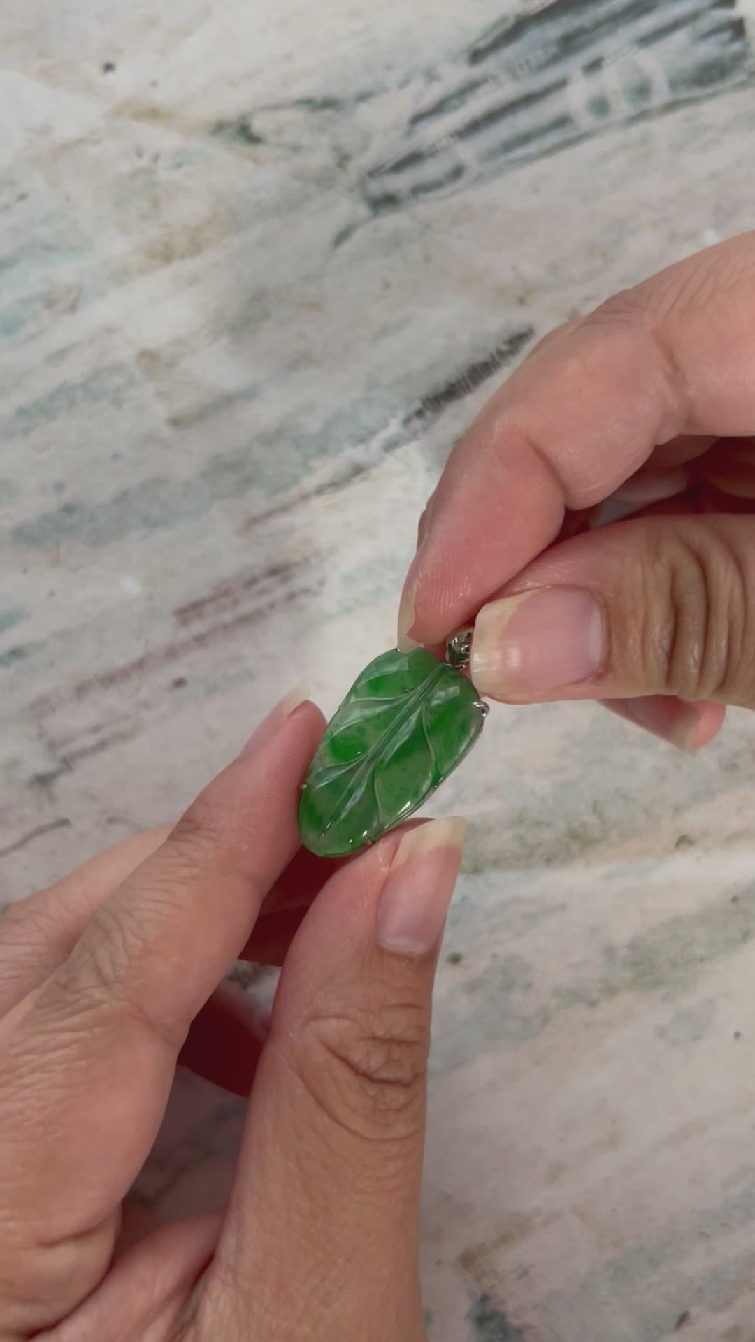 Natural Grade A Burmese Jadeite 18K white Gold Bail Glassy Bright Green Leaf Pendant
