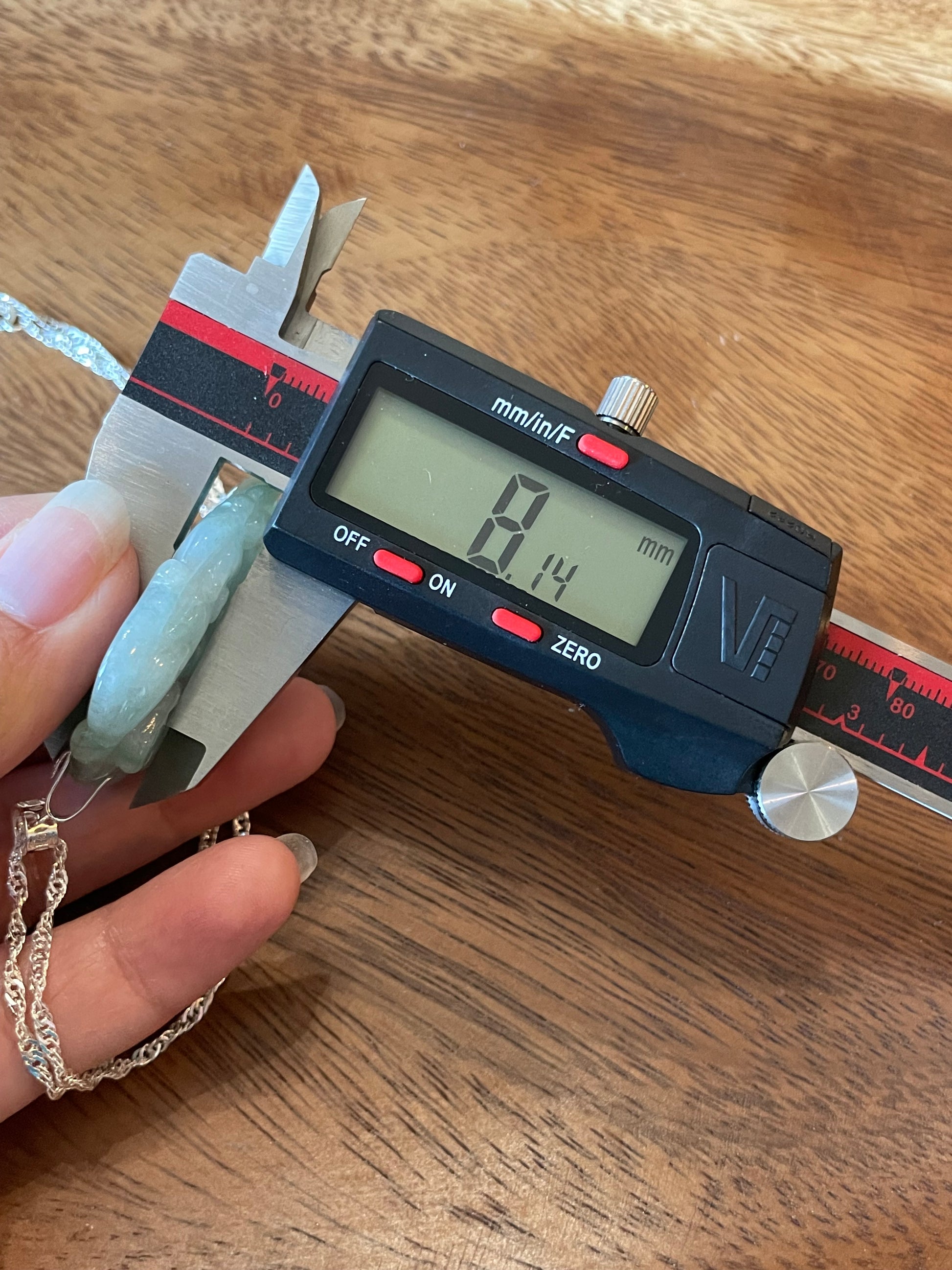 This pendant is translucent, and have some bright green color. It is hand carved on both sides. Height:44.05,mm width:35.65mm thickness:8.14