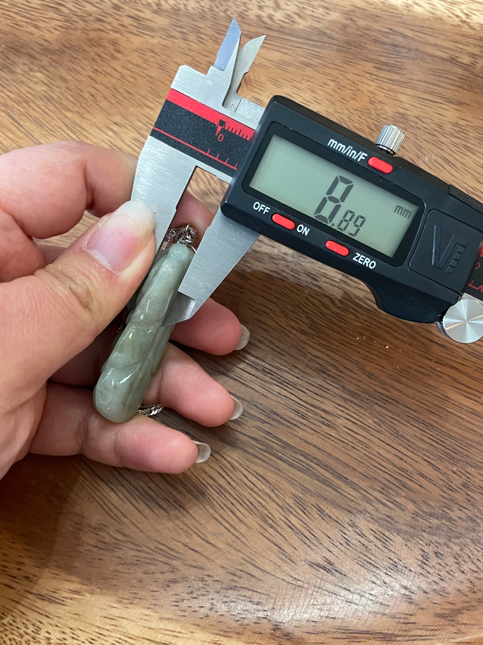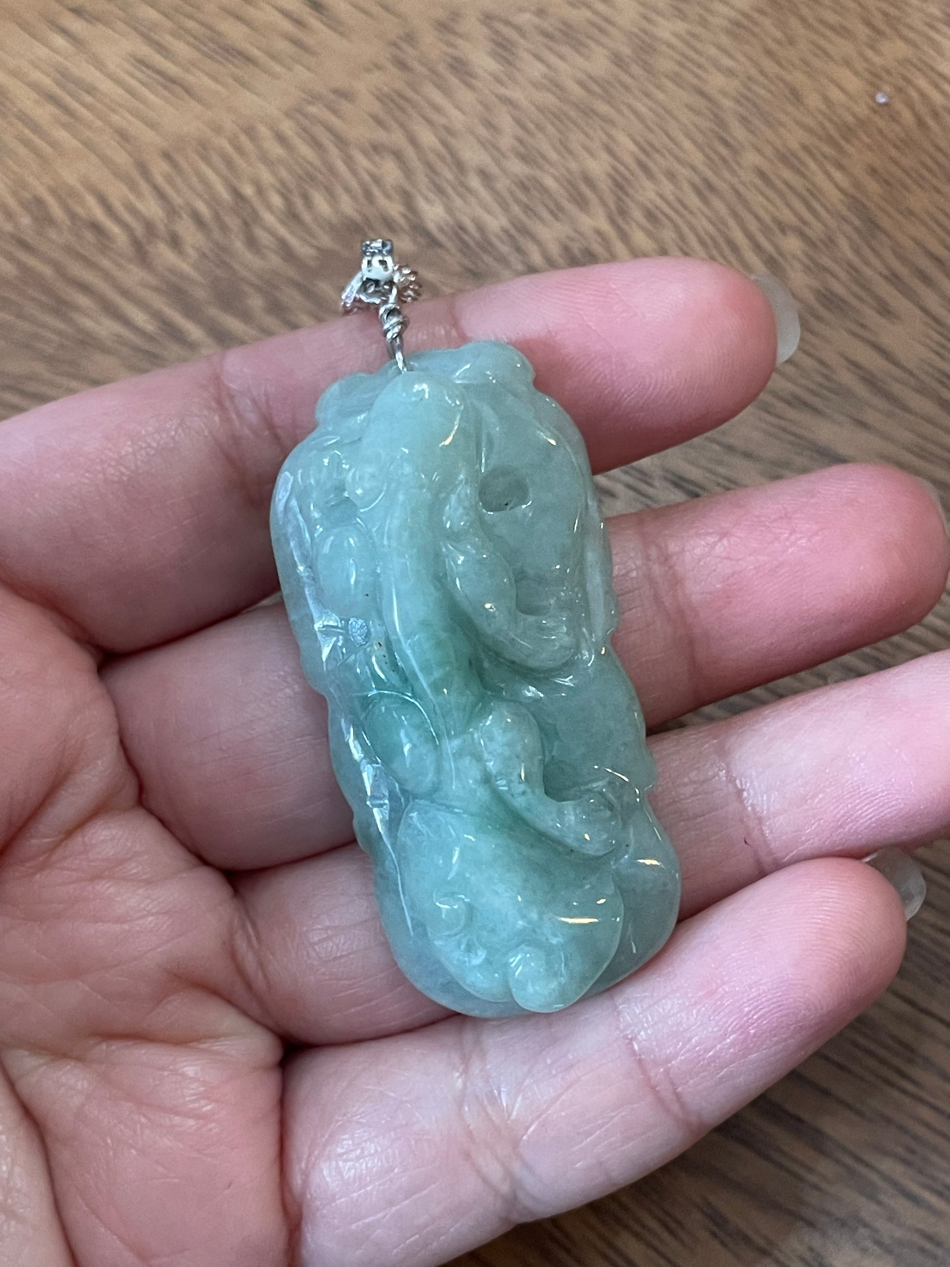 This pendant is translucent, and have some bright green color. It is hand carved on both sides .Height:49.52,mm width:23.91mm thickness:8.89mm.
