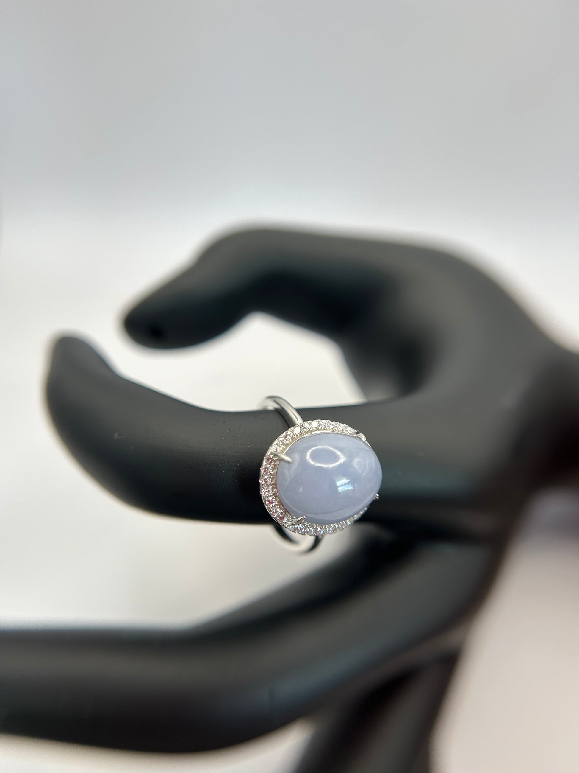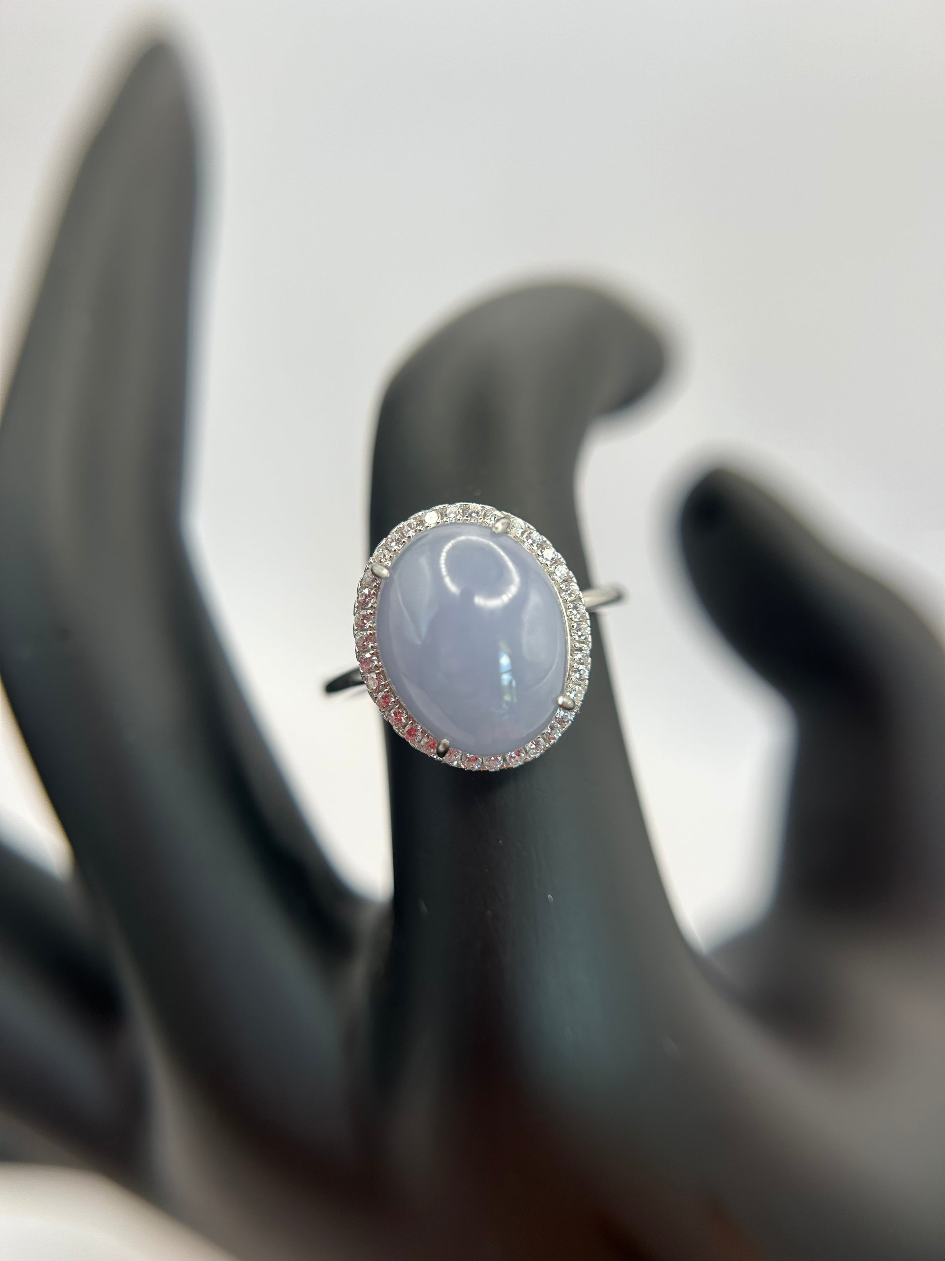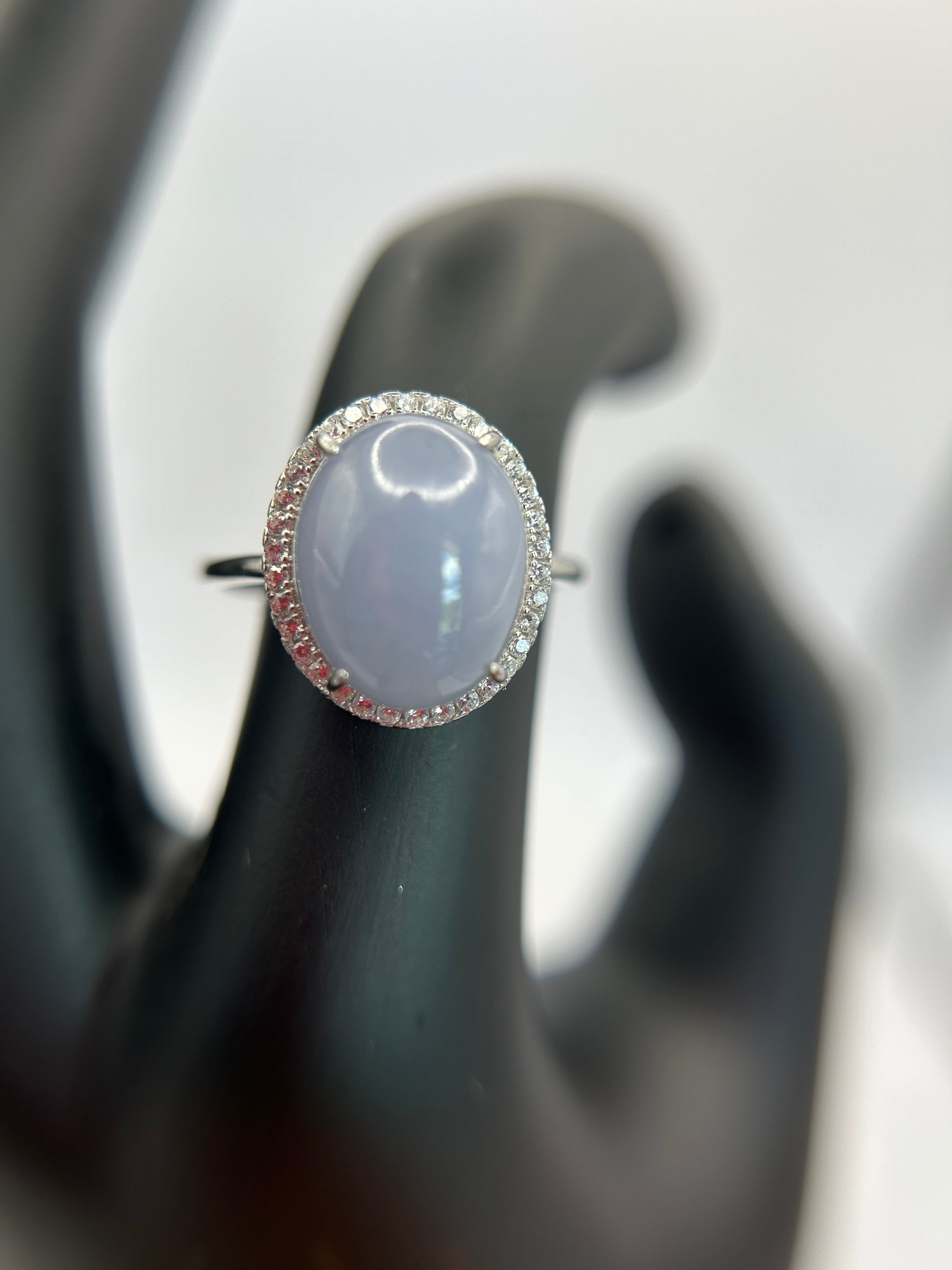 Natural grade A Burmese Lavender Jadeite cabochon with Cubic Zirconia Silver Ring