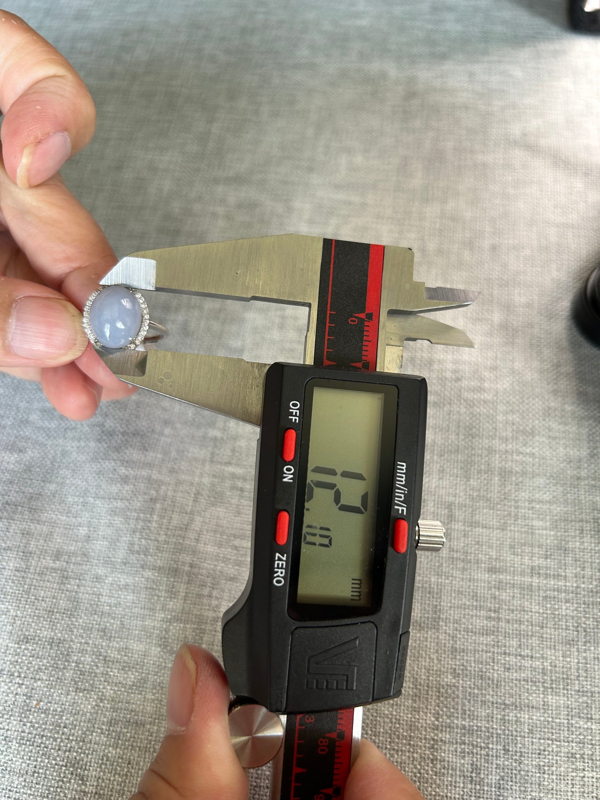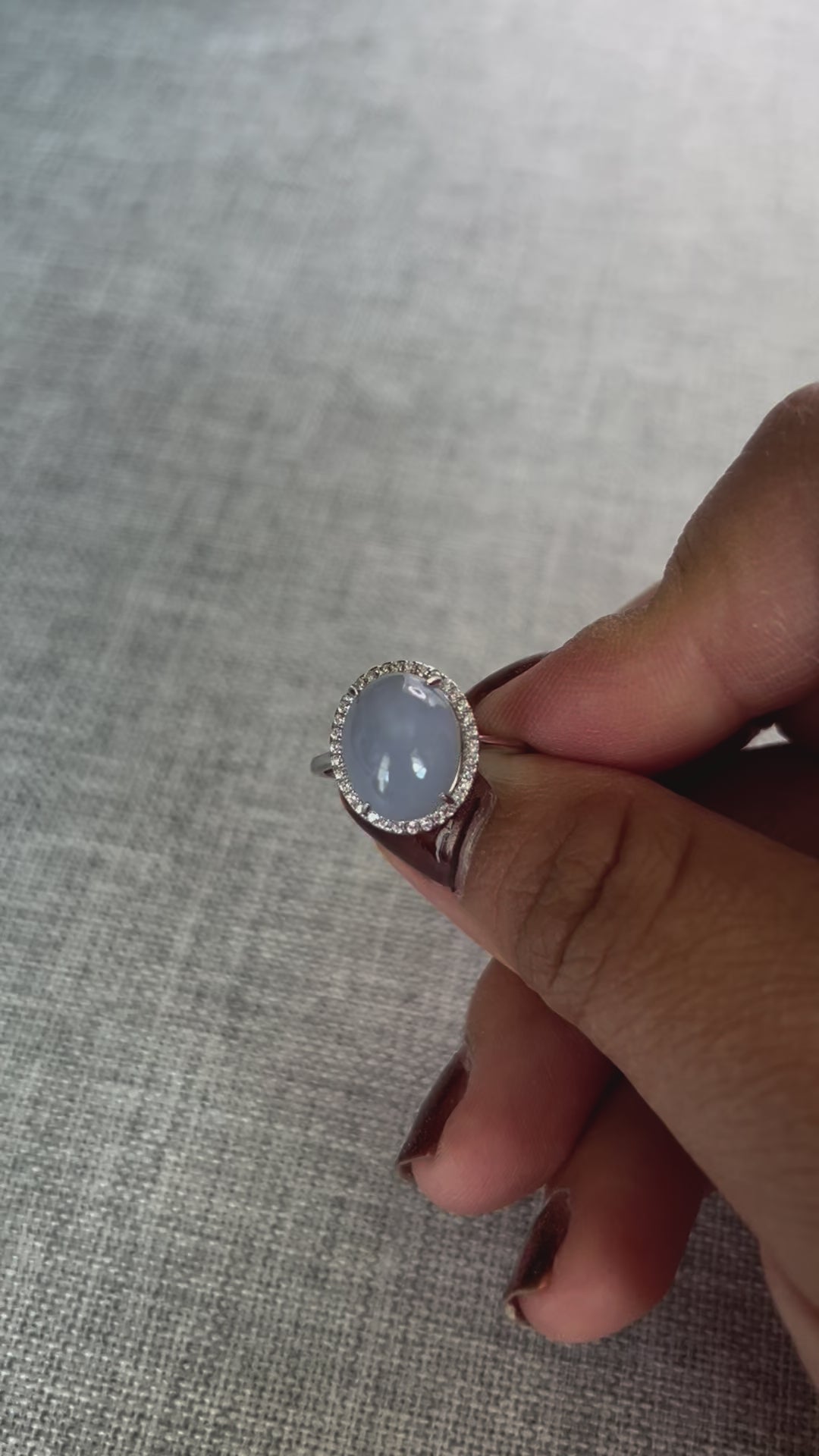 This is a Grade A Burma lavender cabochon jadeite with Cubic Zirconia sterling silver adjustable ring. The jadeite cabochon size is 12.1 X 9.71mm