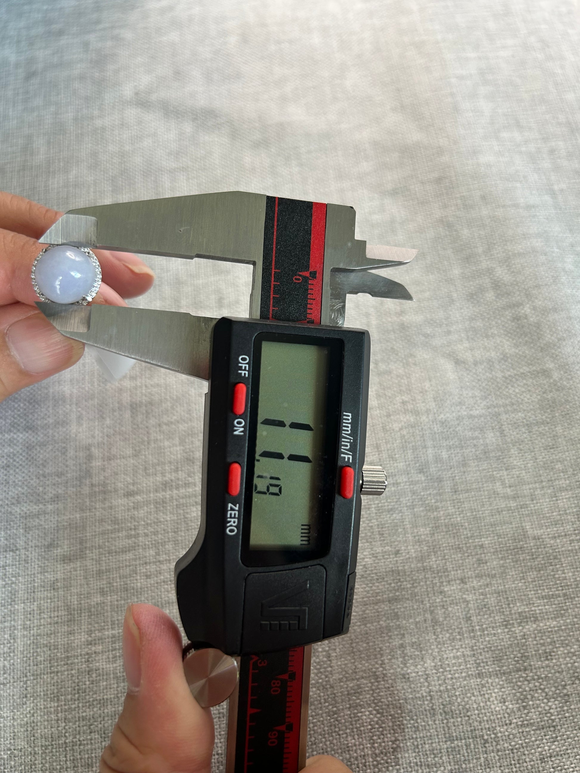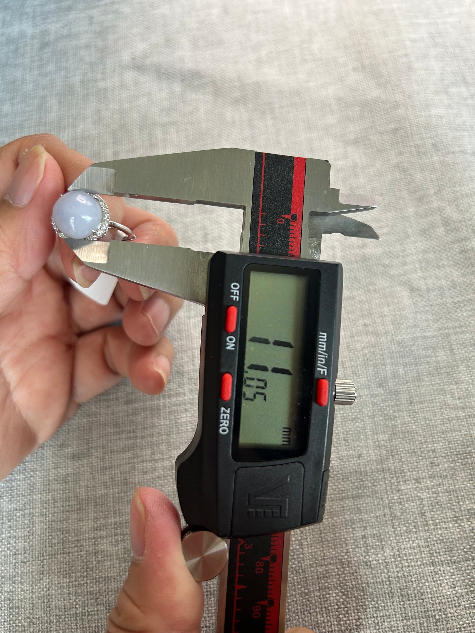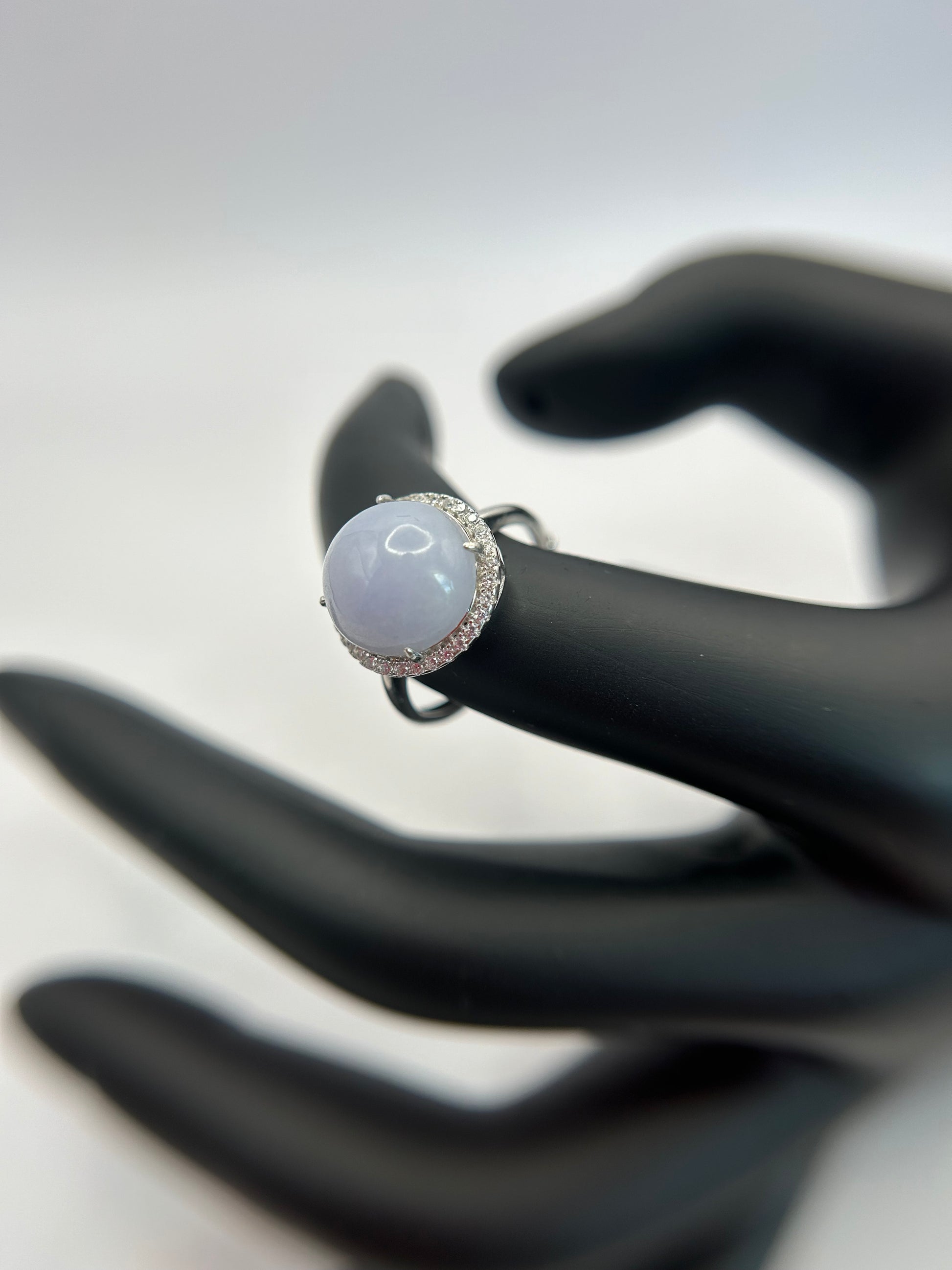This is a Grade A Burma lavender cabochon jadeite with Cubic Zirconia sterling silver adjustable ring. The jadeite cabochon size is 11.05 X 11.19mm