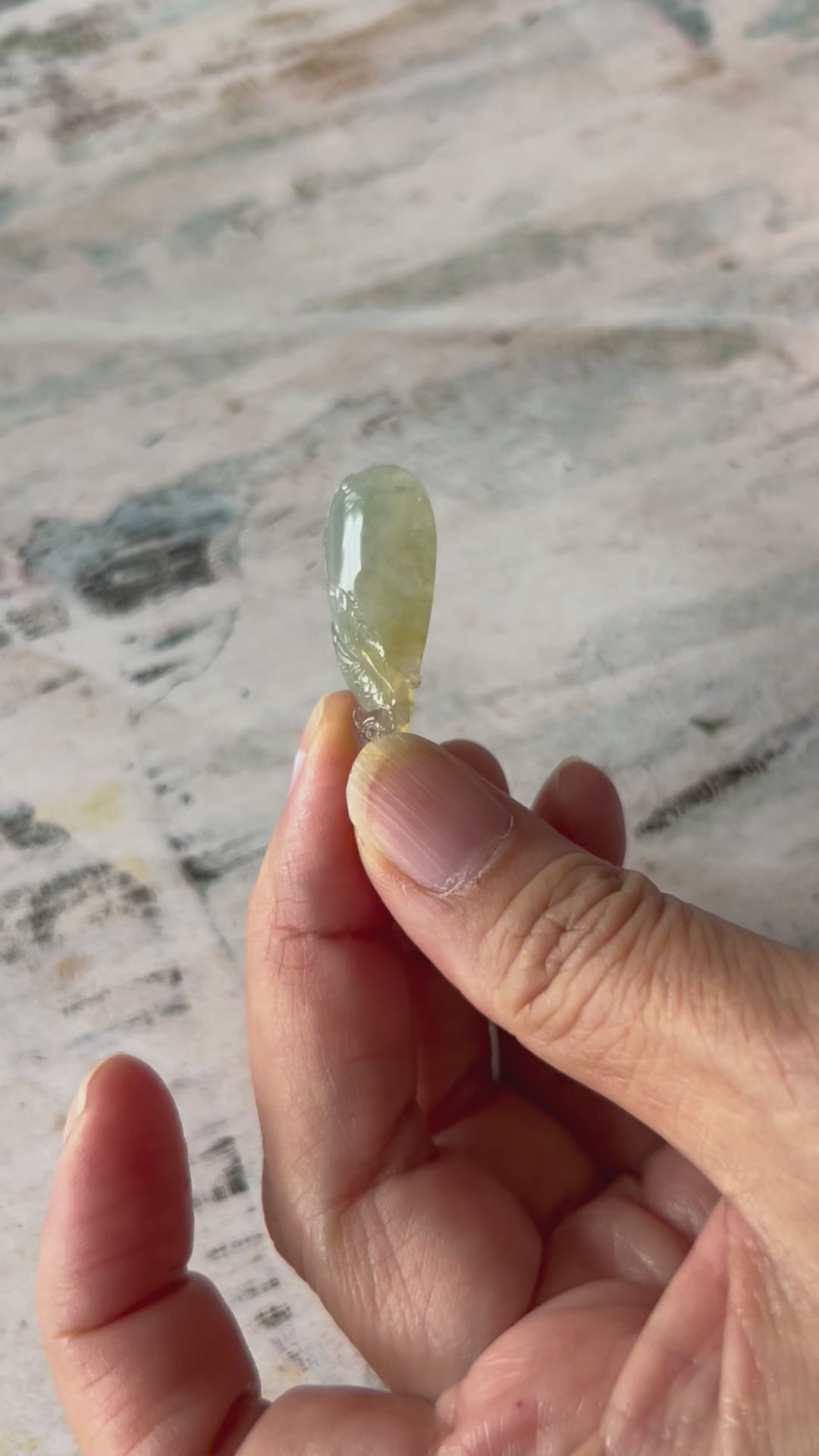 This pendant is translucent, and Icy yellow color. It is hand carved on both sides. Height:30.86mm width:12.41 mm thick:4.43mm