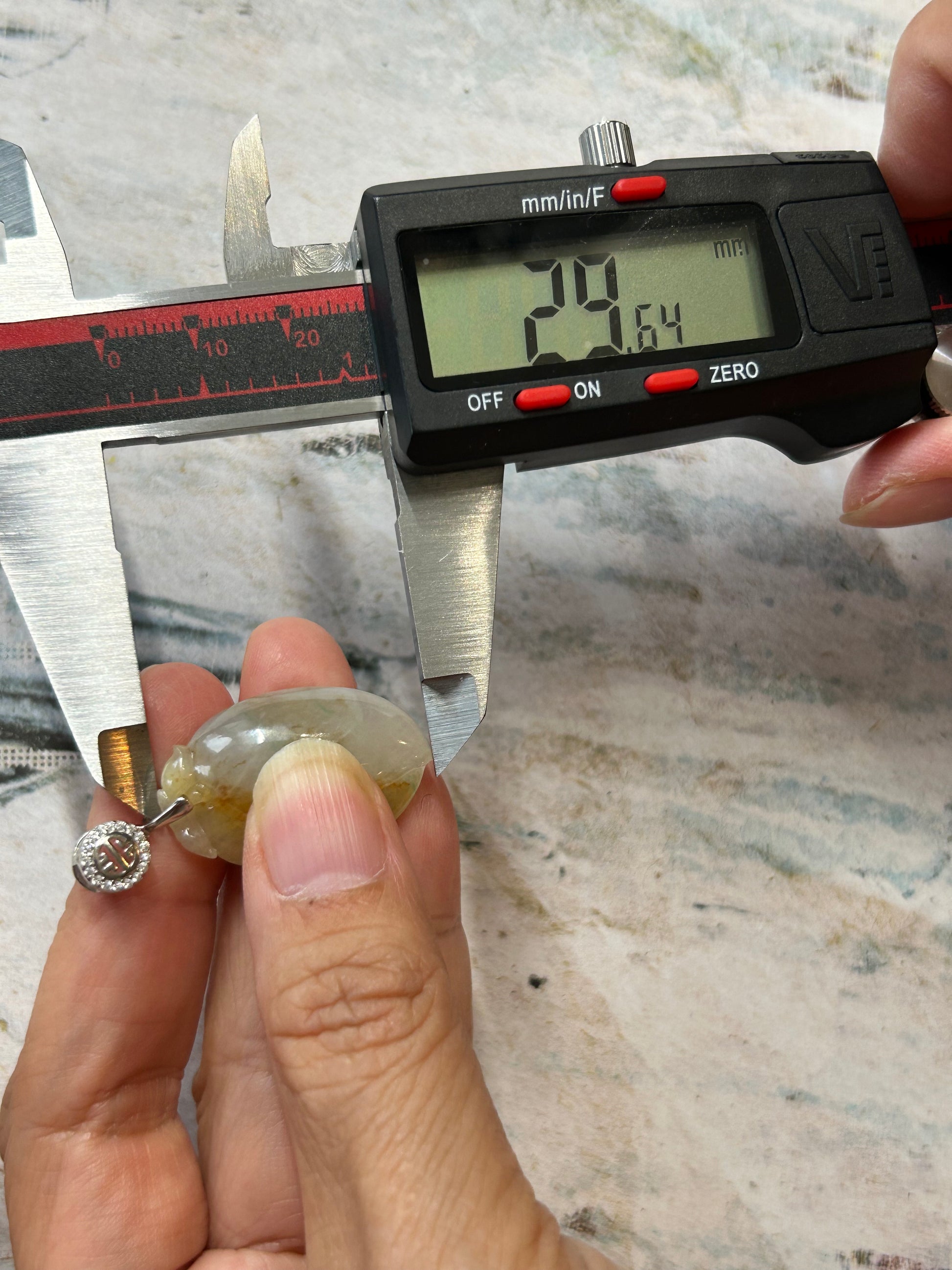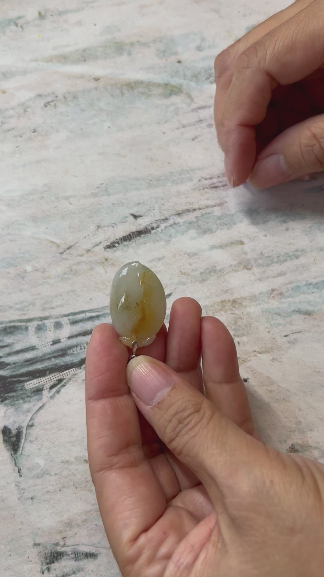 This pendant is translucent, and Icy yellow color. It is hand carved on both sides. Height:29.64mm width:19.22 mm thick:10.26mm