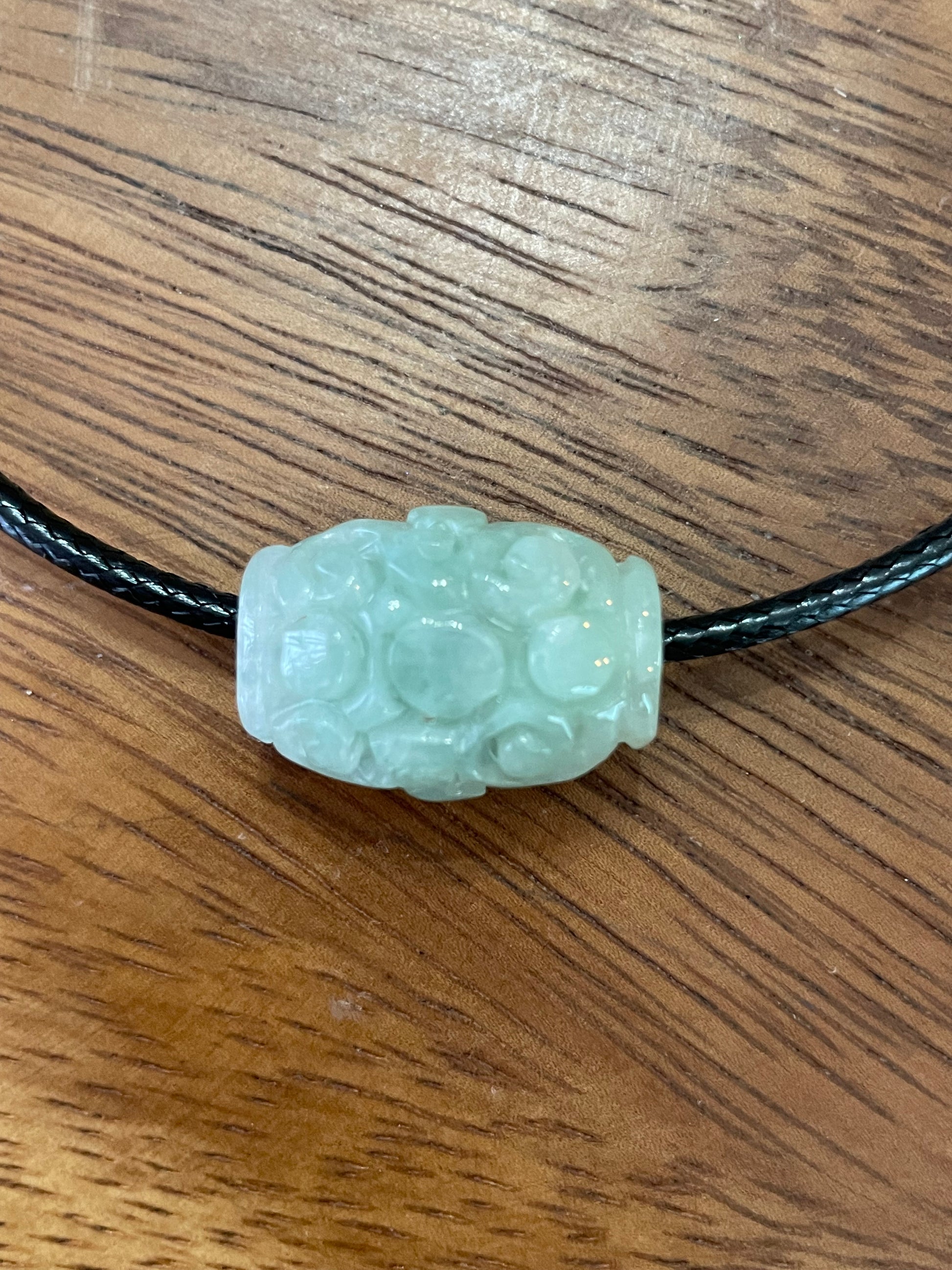 This Green jadeite is translucent and the Black silk cord to catch the attention of many. the barrel gives a modern look. This can be easily dress up or down.